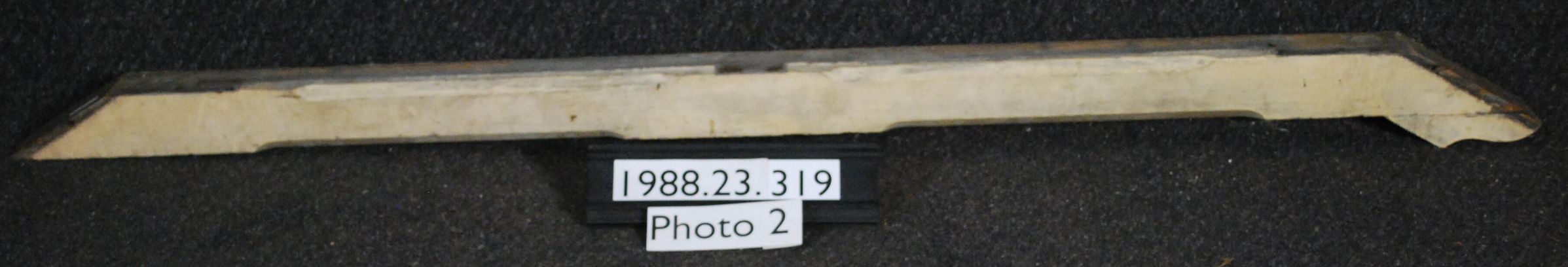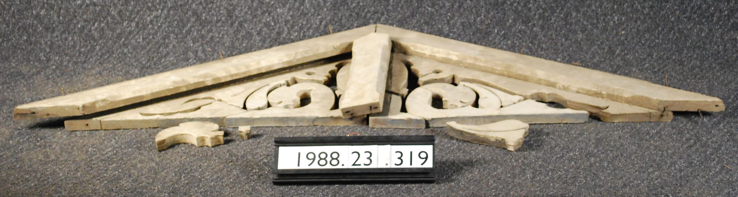 Exterior wood bargeboard. A-Frame with fret-sawn ornamentation. Originally mounted into panels. Now dissassembled. Broken, incomplete. Associated with 1988.23.318. Painted beige.