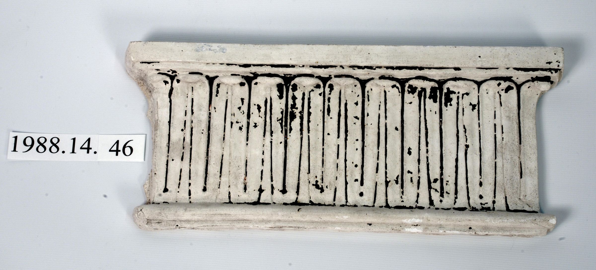 Reproduction molded plaster. Straight edge, has foliated center, radiused lower edge. Residue of brownish accretion.
