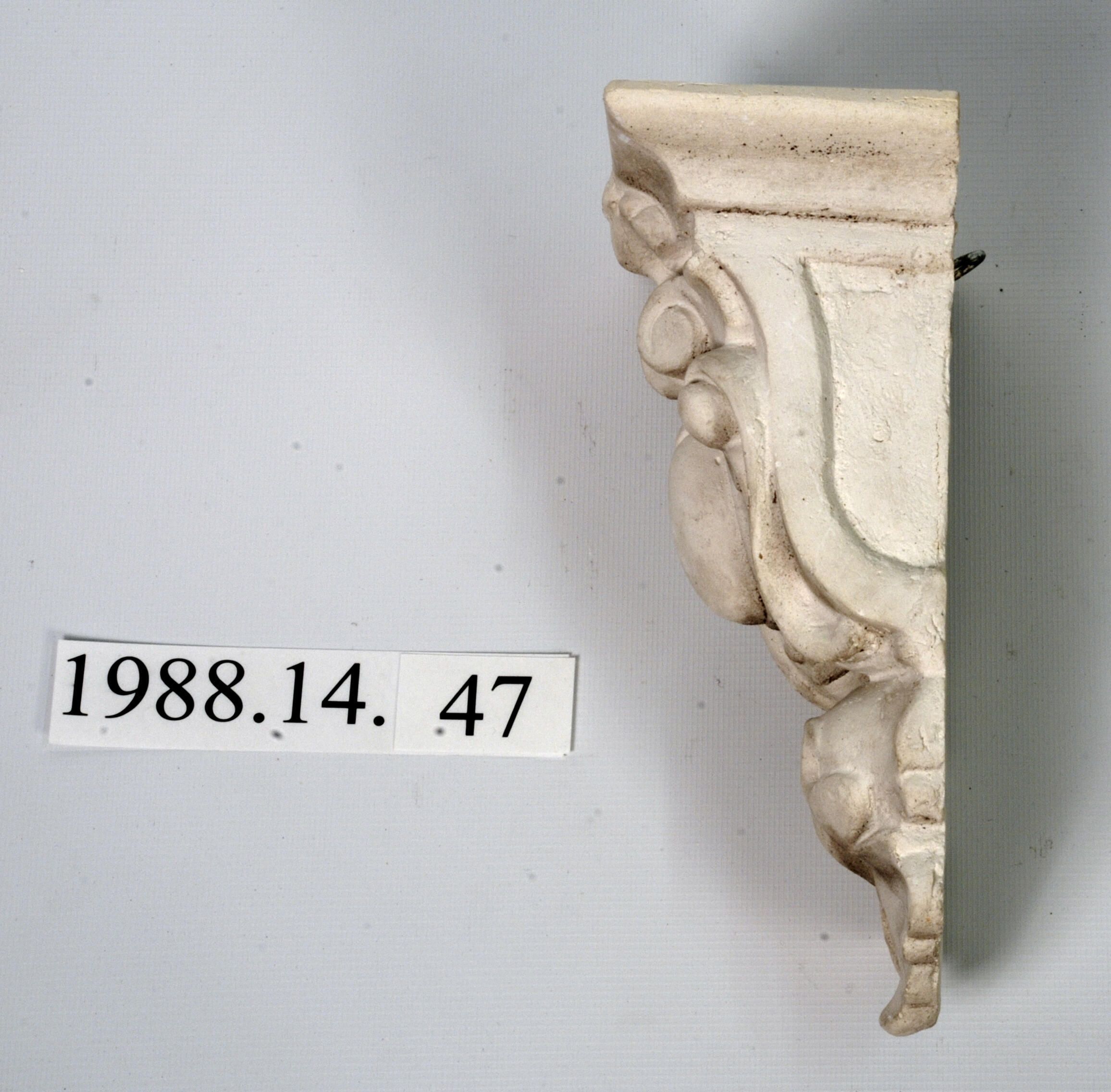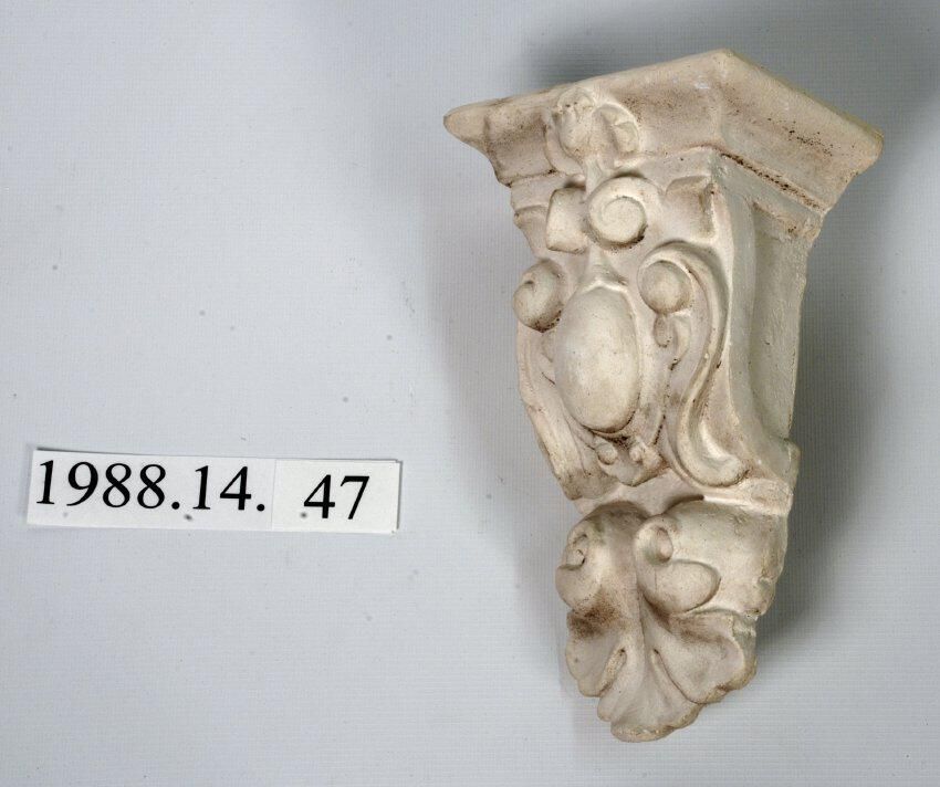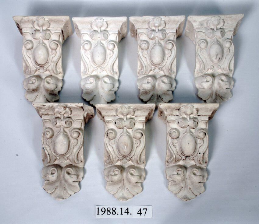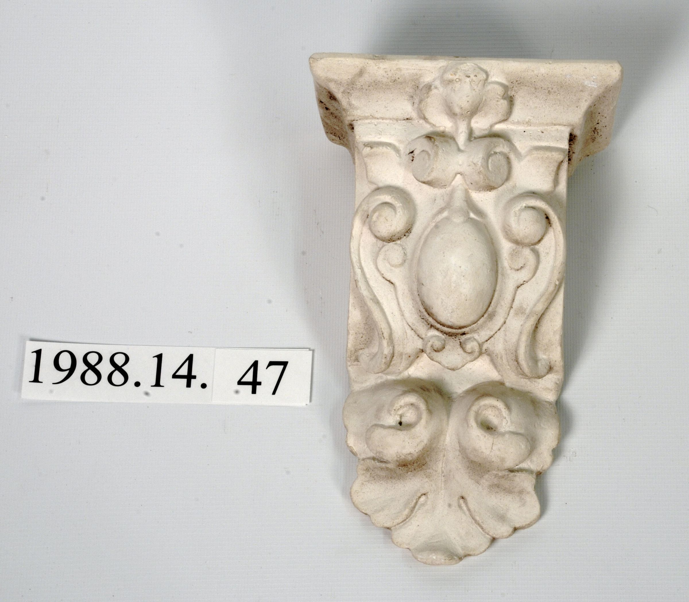 Reproduction molded plaster bracket with central egg and foliated scroll and leaf motif. One bracket marked on back "sample"." Each has wire loop fastener.
