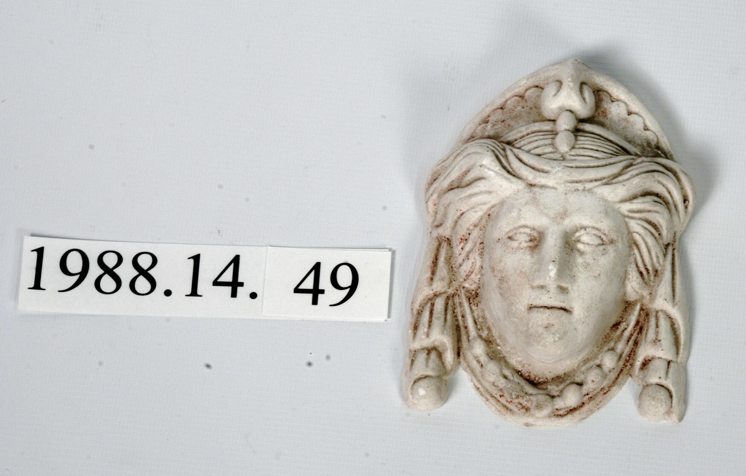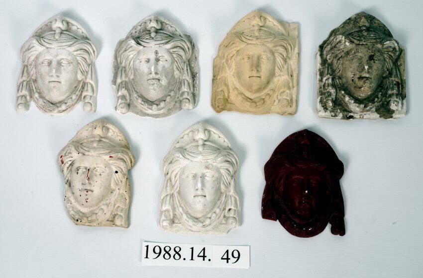 Reproduction molded plaster. Classic Revival style relief. Female figure head with tiara, drape and bead motif. Seven figures - some with finish. Various stages of production.