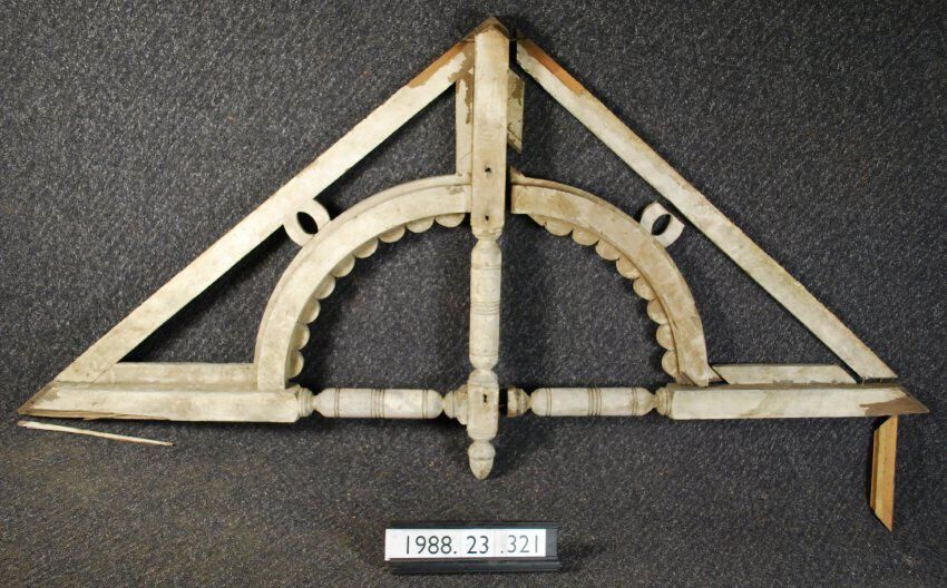 Elaborate bargeboard. A-Frame (partially dissassembled). Turned posts. Semi-circular arched segment. Fret-sawn ornaments. Incomplete. Painted white. Inscriptions or Markings: Manufacturer: Place of Manufacturer: Design motif: Style: Finish: Painted White