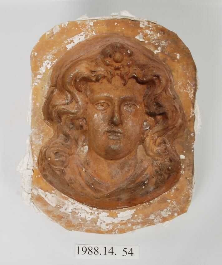 Rubber facing with plaster mother mold. Plaster is reinforced with gauze. Classical Revival female figure head . Concave interior.