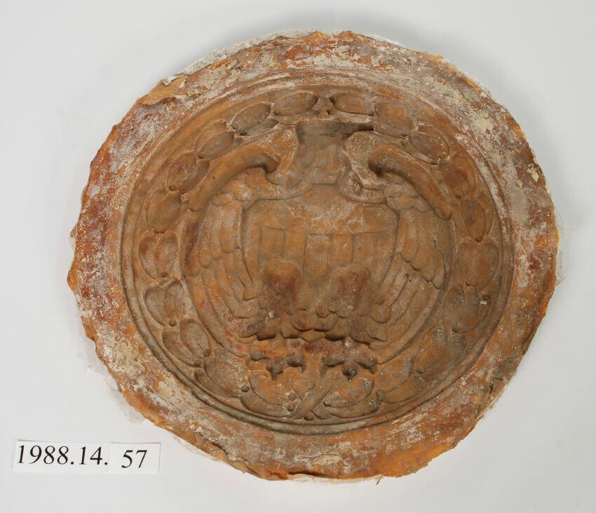 Rubber facing with plaster mother mold for wall medallion. Circular plaster backing. Circular wreath motif with eagle and shield with vertical stripes..