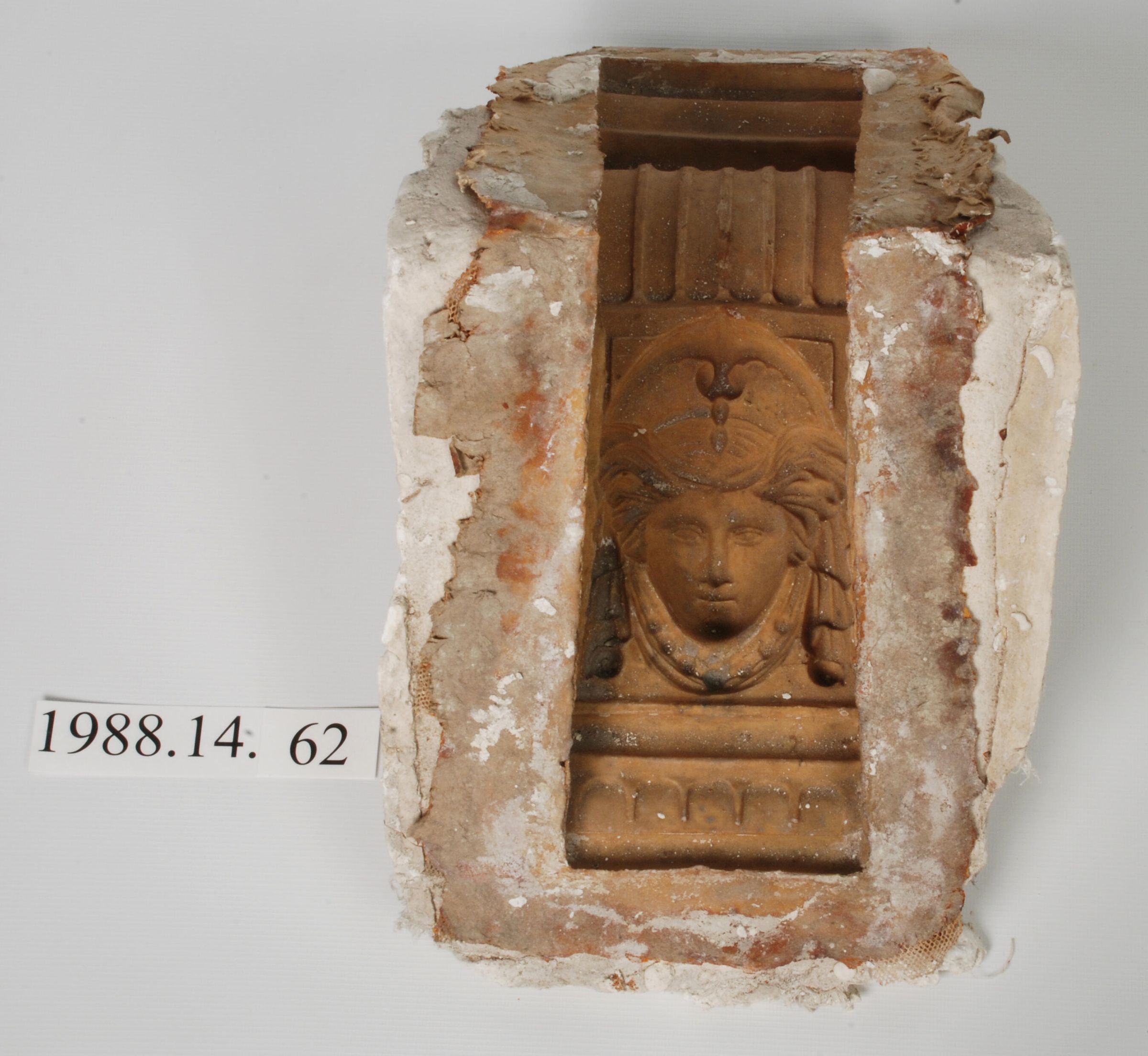 Rubber facing and plaster mother mold for bracket. Scrolled, molded fluted sides and front. Central Classical Revival female figure head portrait.