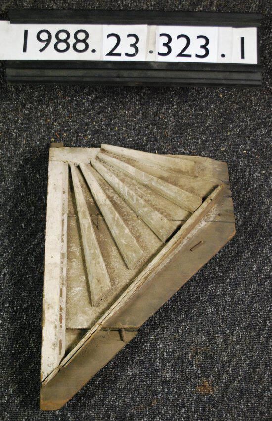Exterior wood ornament. Irregular quadrangle. Built-up construction. Has applied moldings. Sunburst motif. (Bullseye and some moldings missing). Painted beige.