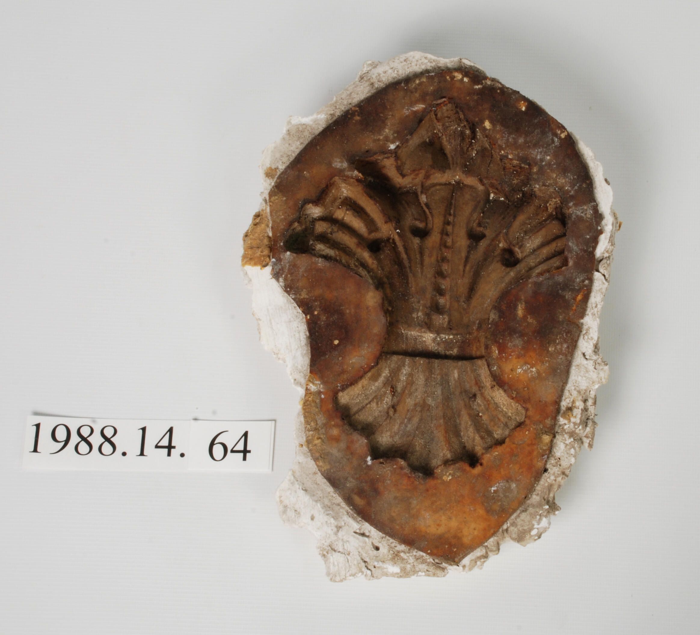 Rubber facing with plaster mother mold, to cast botanical motif similar to fleur-de-lis.