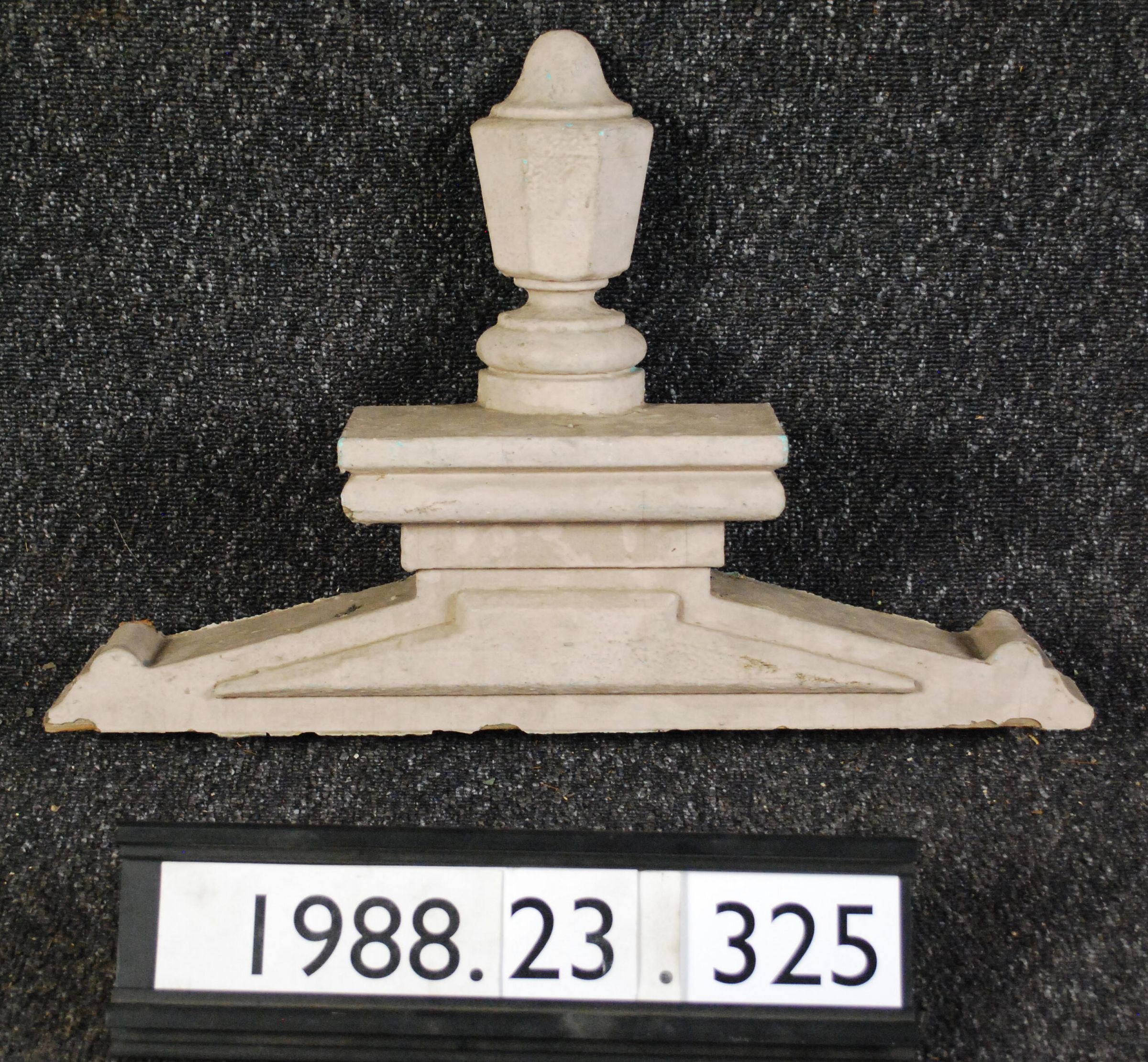 Exterior wood ornament. Pediment with finial. Painted beige / pink. Inscriptions or Markings: Manufacturer: Place of Manufacturer: Design motif: Style: Finish: Painted Beige / Pink