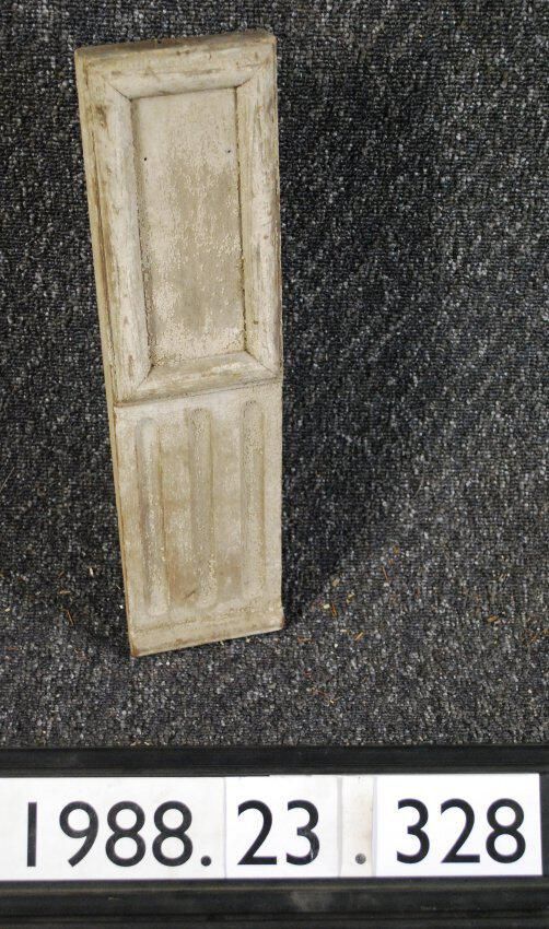 Exterior wood block ornament. Fluted front with recessed panel. Painted white. Inscriptions or Markings: Manufacturer: Place of Manufacturer: Design motif: Style: Finish: Painted White