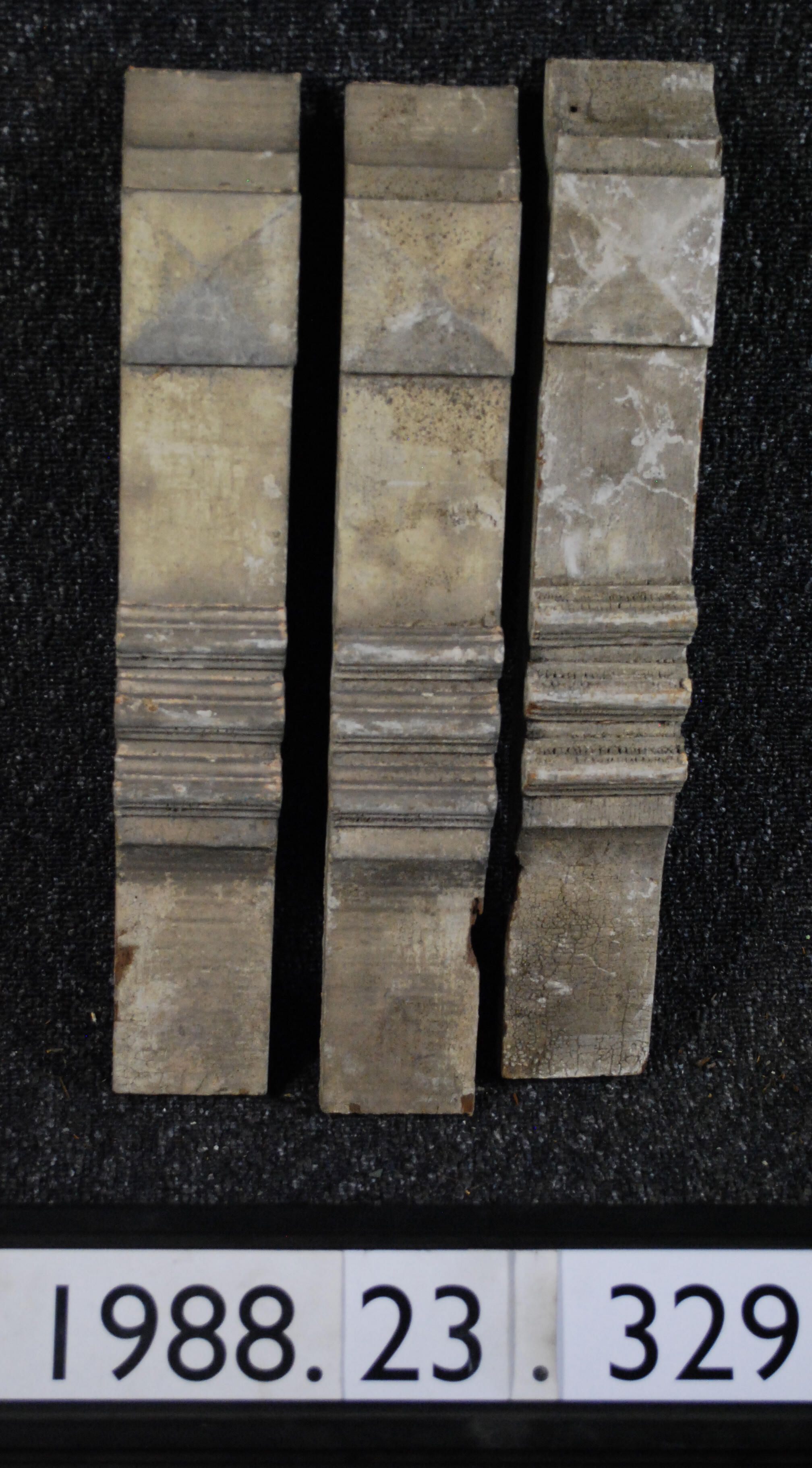 One lot of three exterior wood block ornaments. Compound profile with applied low profile pyramid. Applied block.