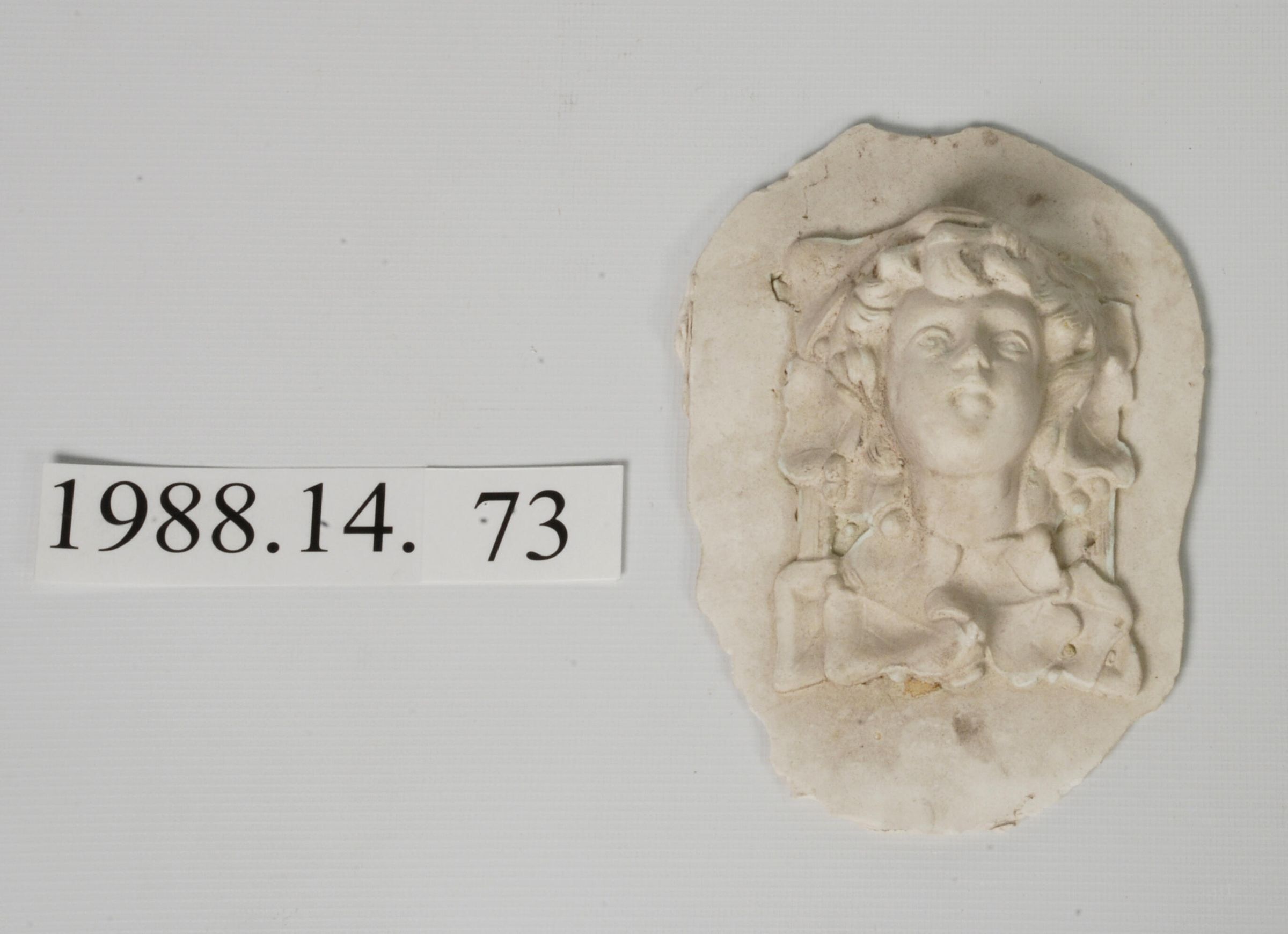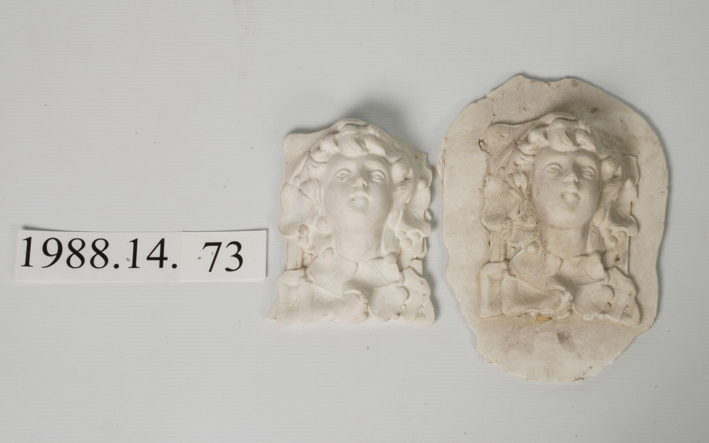 Reproduction molded plaster. Two identical castings. One untrimmed from mold. Relief child's head. Foliated surround labelled A, B.