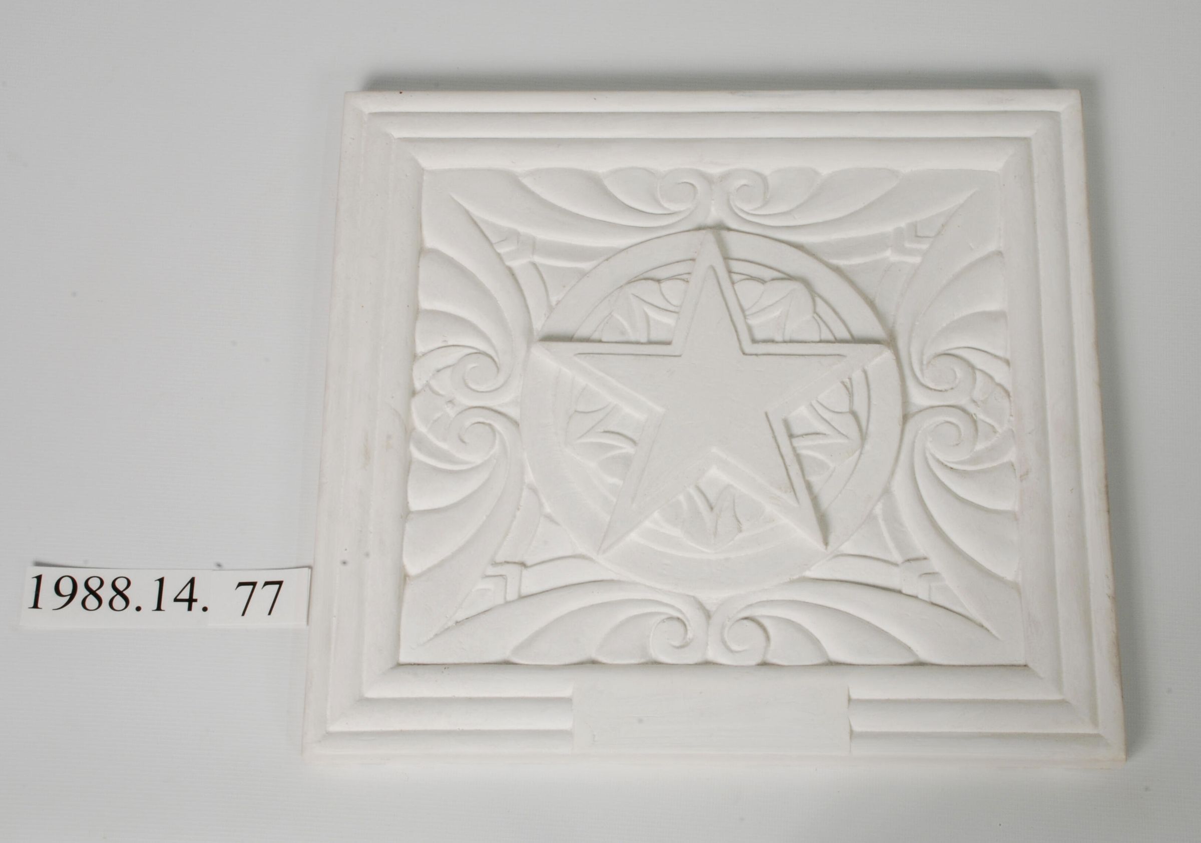 Reproduction molded plaster. Rectangular "frame" star in 7.5" circle in center. Nouveau scrolled pattern between frame, circle. Note: same pattern as used for Bosco-Milligan Foundation awards.