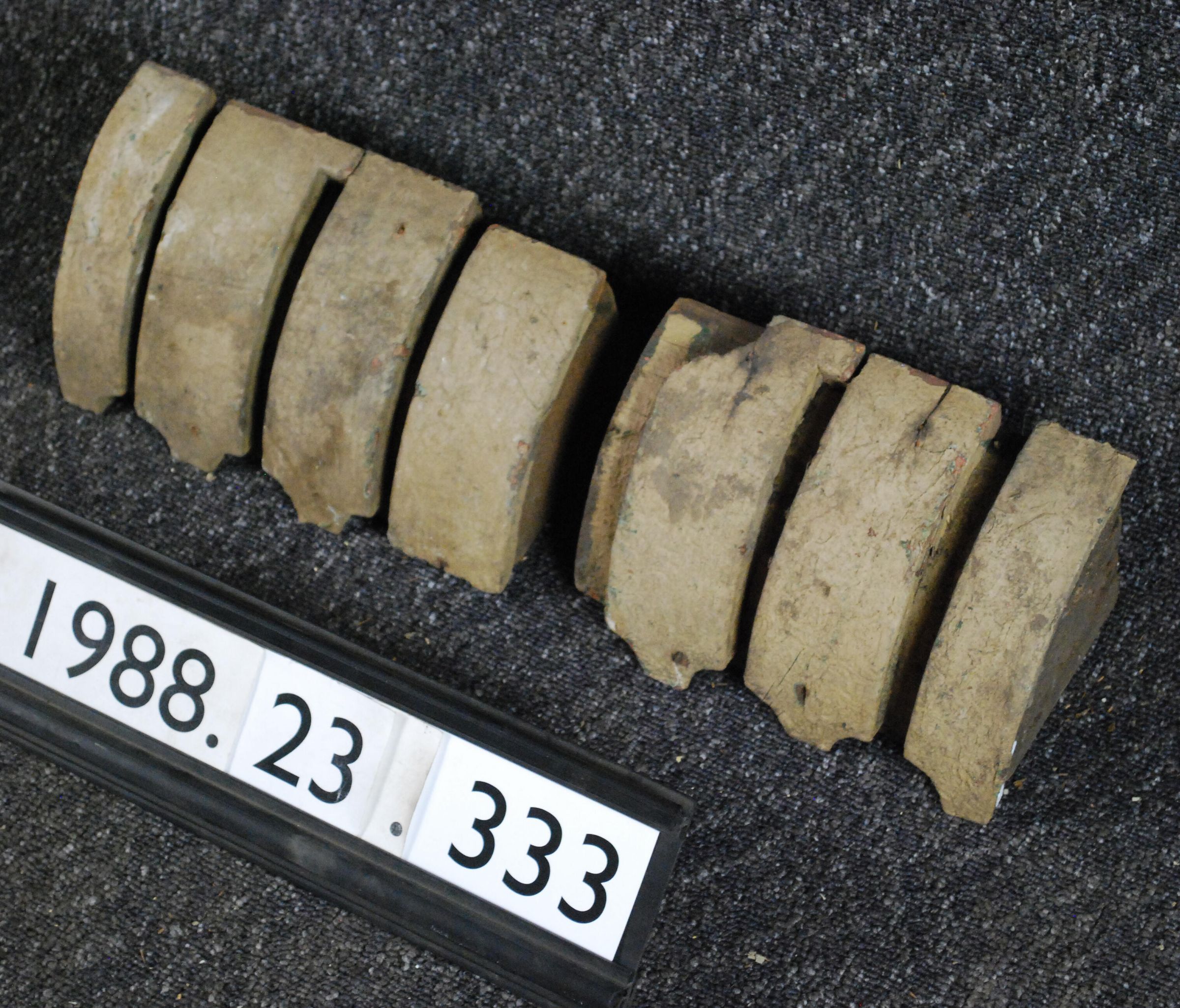 One lot of two exterior wood block ornaments. Quarter round in cross-section. Each has series of curved applied ornaments. Parts detached or missing. Painted beige.