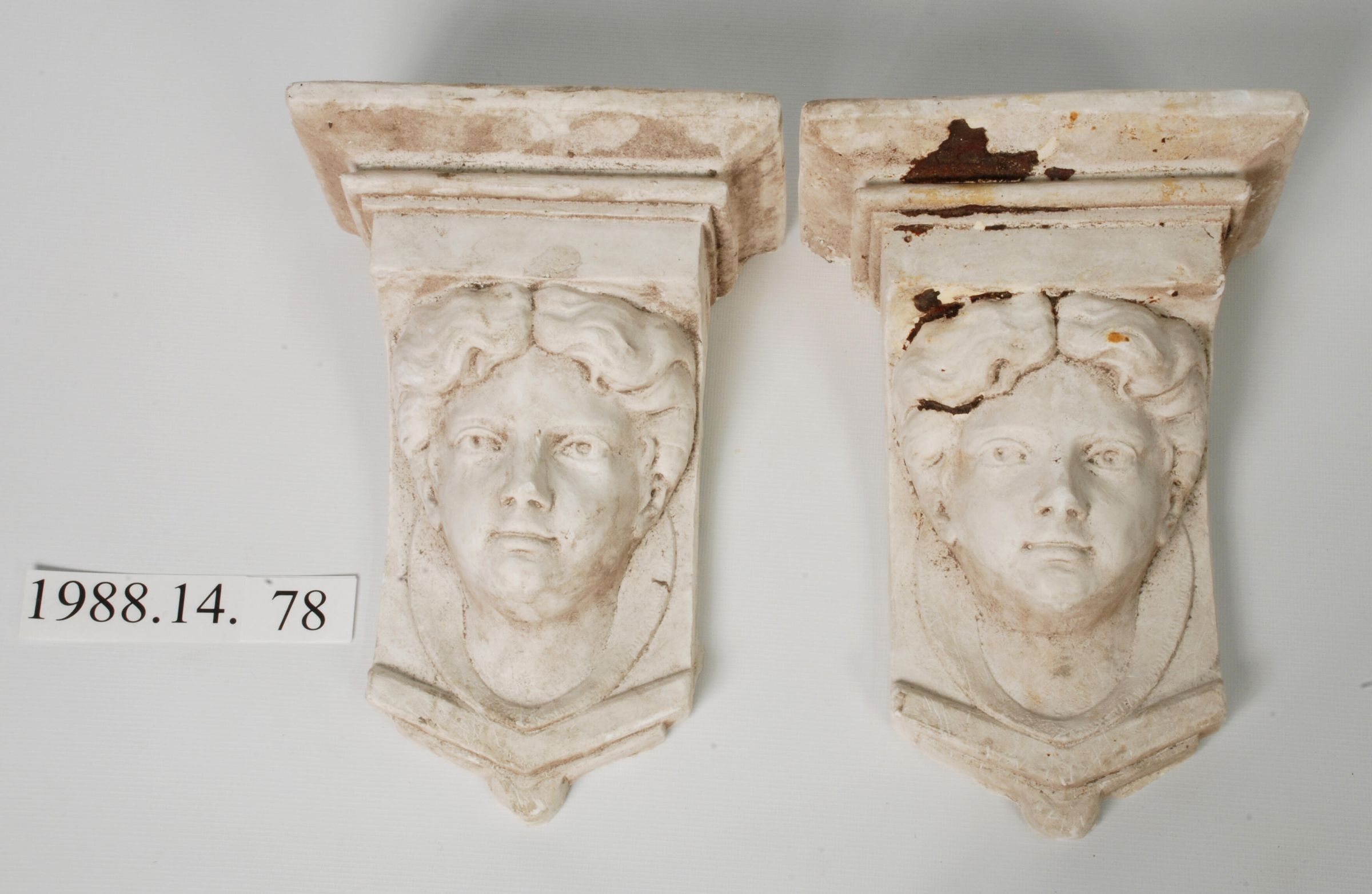 Reproduction molded plaster. Deep relief of youth head, two identical. Pendant drop lower edge labelled A & B.