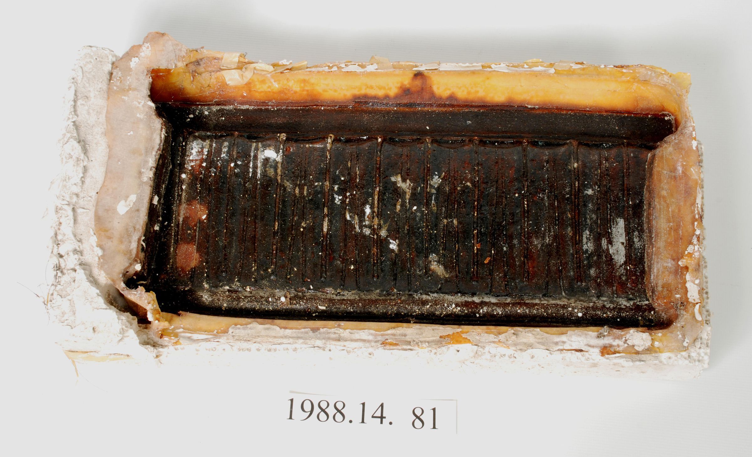 Rectangular plaster mother mold and cloth reinforced rubber liner for molding capital. (See 1988.14.46). Straight edge, foliated center. Radiused lower edge.