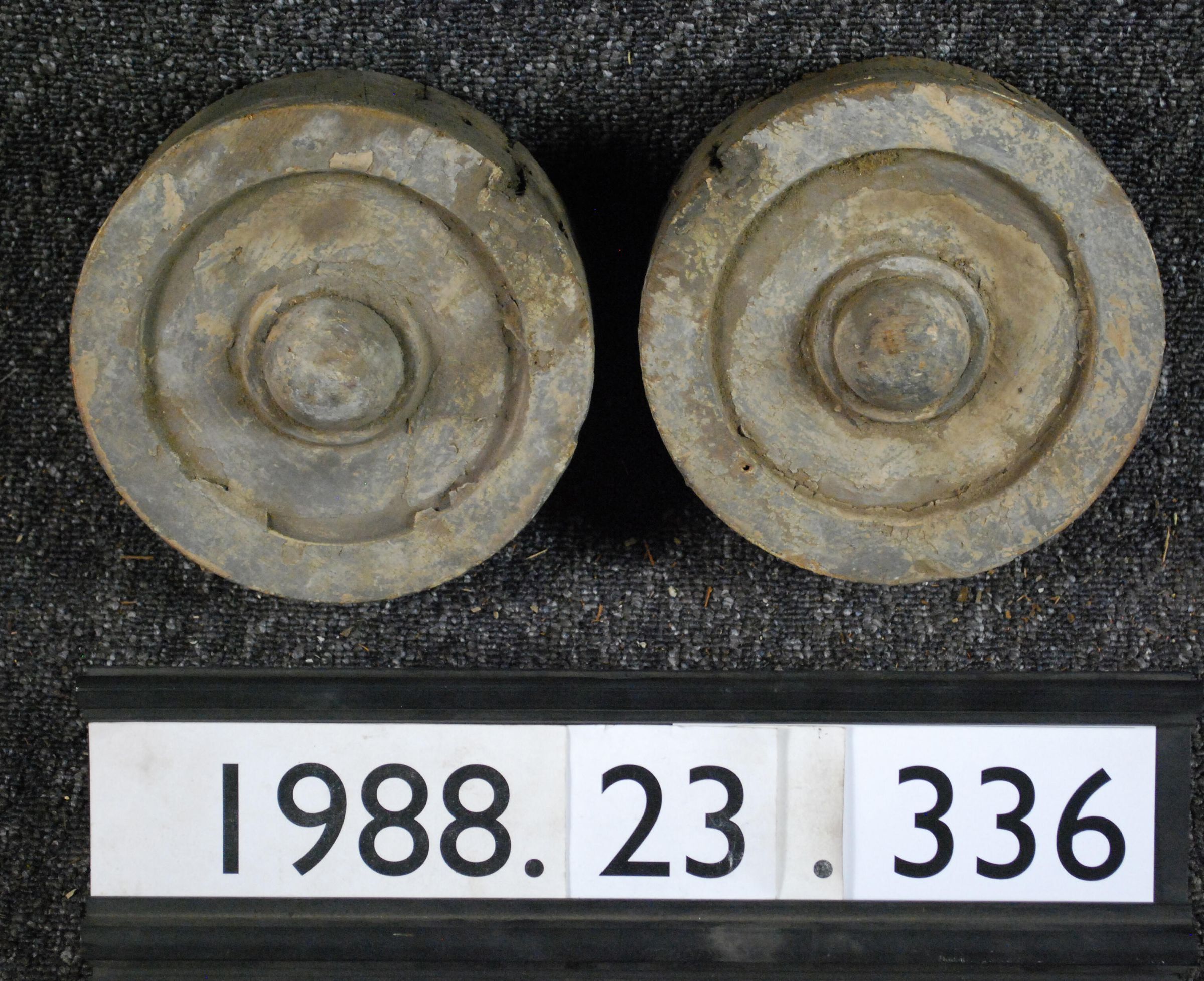 One lot of two exterior wood ornaments. Each is turned. Disc with bullseye on one side. Remnants of paint.