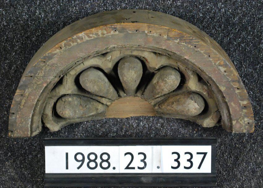 Exterior wood ornament. Semi-cylindrical with carved ornaments. Piece missing. Painted. Inscriptions or Markings: Manufacturer: Place of Manufacturer: Design motif: Style: Finish: Painted