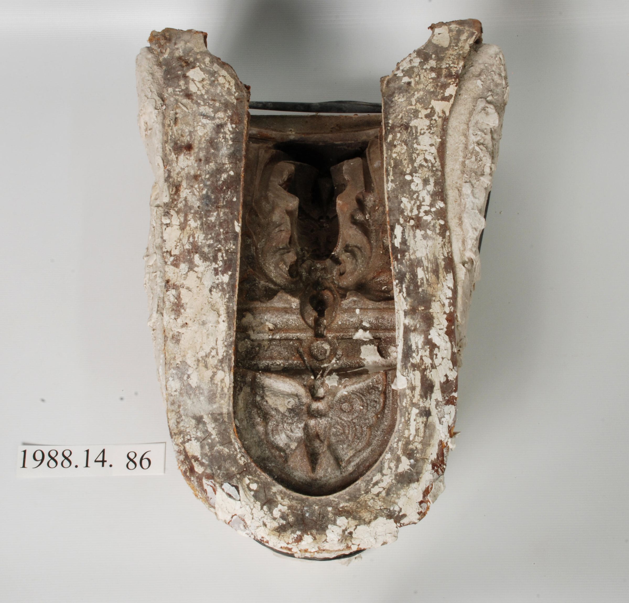 Rubber facing and plaster mother mold for bracket. (See 1988.14.8 and 1988.14.9). Bearded male figure head, scroll, leaf / butterfly motif.