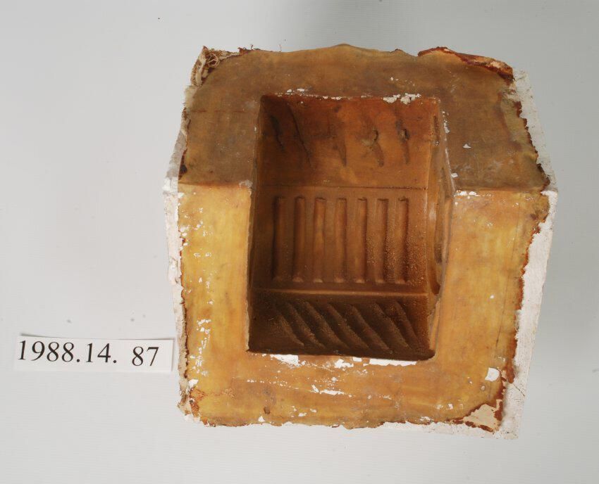 Cloth reinforced rubber facing and two-piece mother mold for bracket block. (See 1988.14.22). Design has vertical fluting flanked on both sides by concentric circular rosettes.