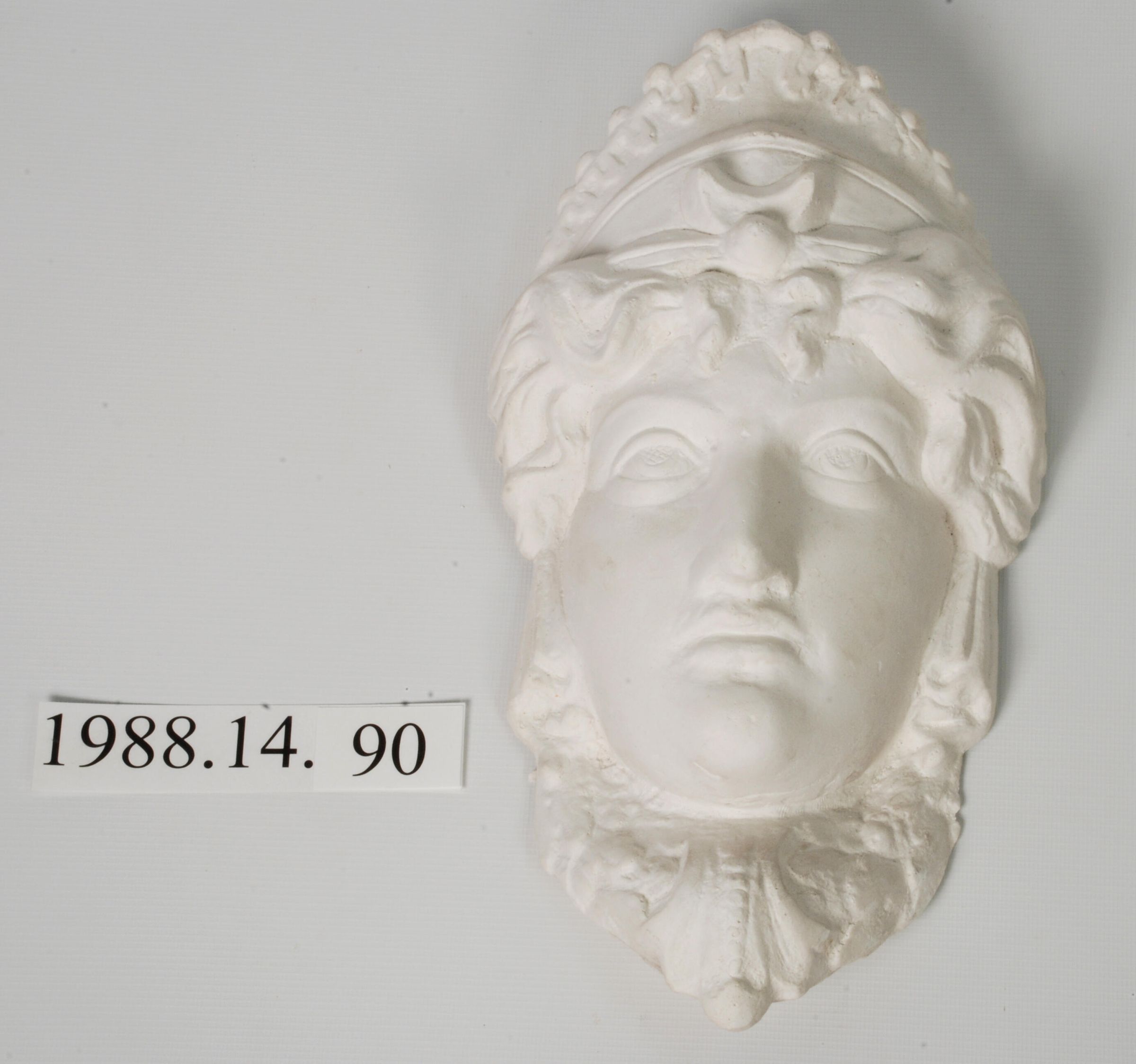 Reproduction molded plaster. Classical revival female figure head. Copied from cast iron architectural element. (See 1988.14.1).