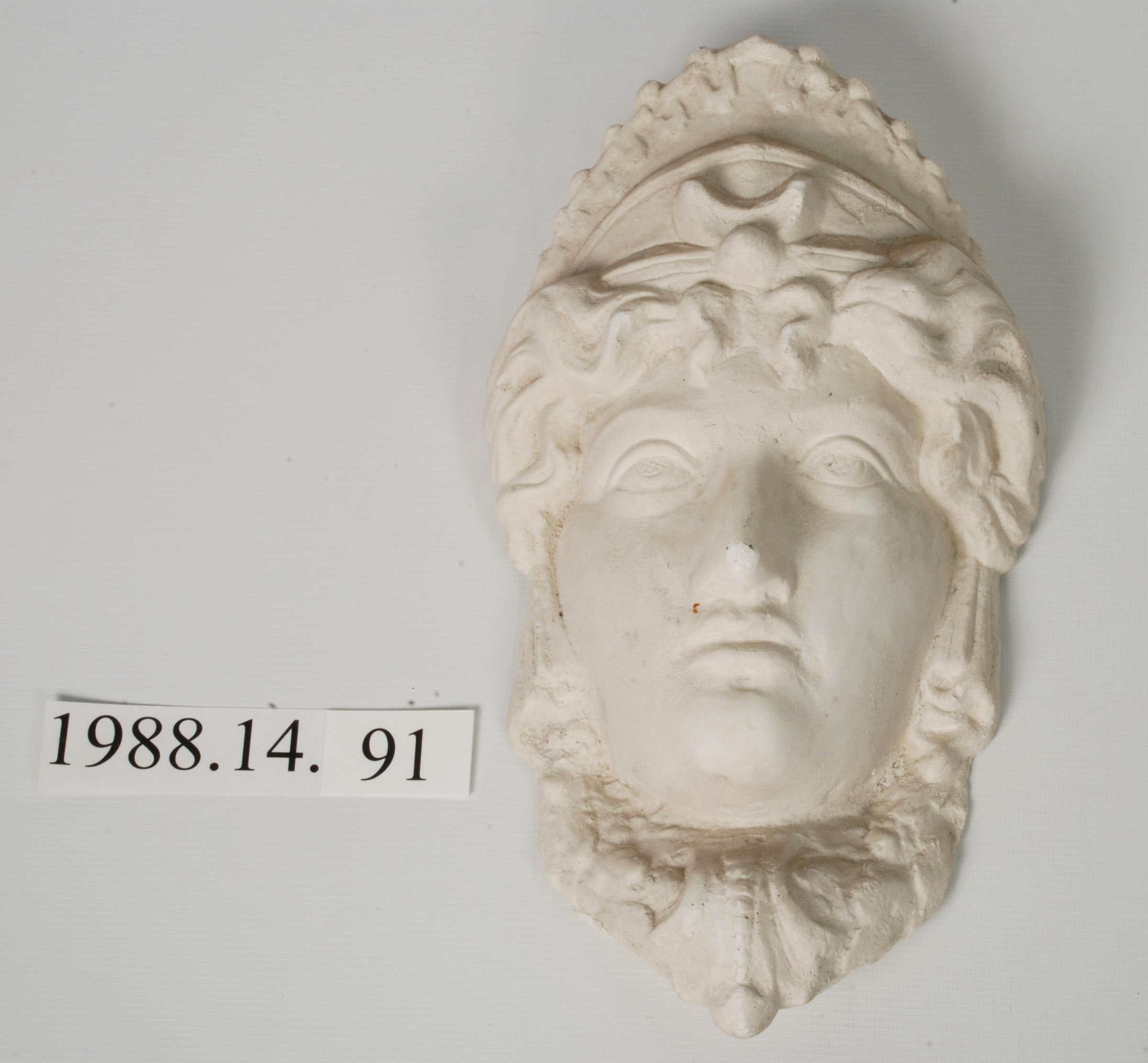 Reproduction molded plaster. Classical revival female figure head. Copied from cast iron architectural element. (See 1988.14.1).