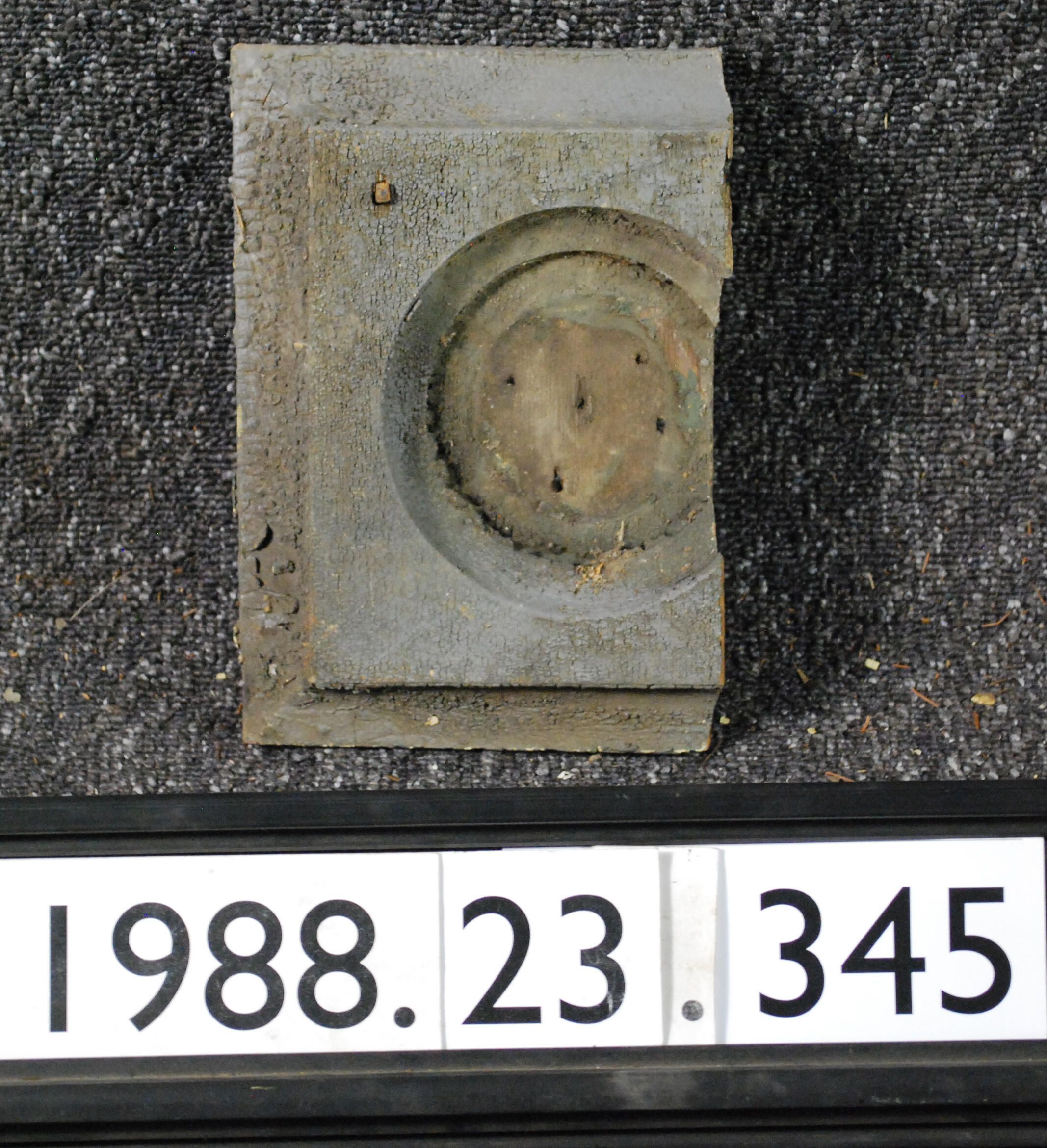 Exterior wood. Square block. Incomplete. Missing edge. Other edges coved. Circular recessed center. Missing central circular ornament. Probably rosette. Square nails. Painted grey.