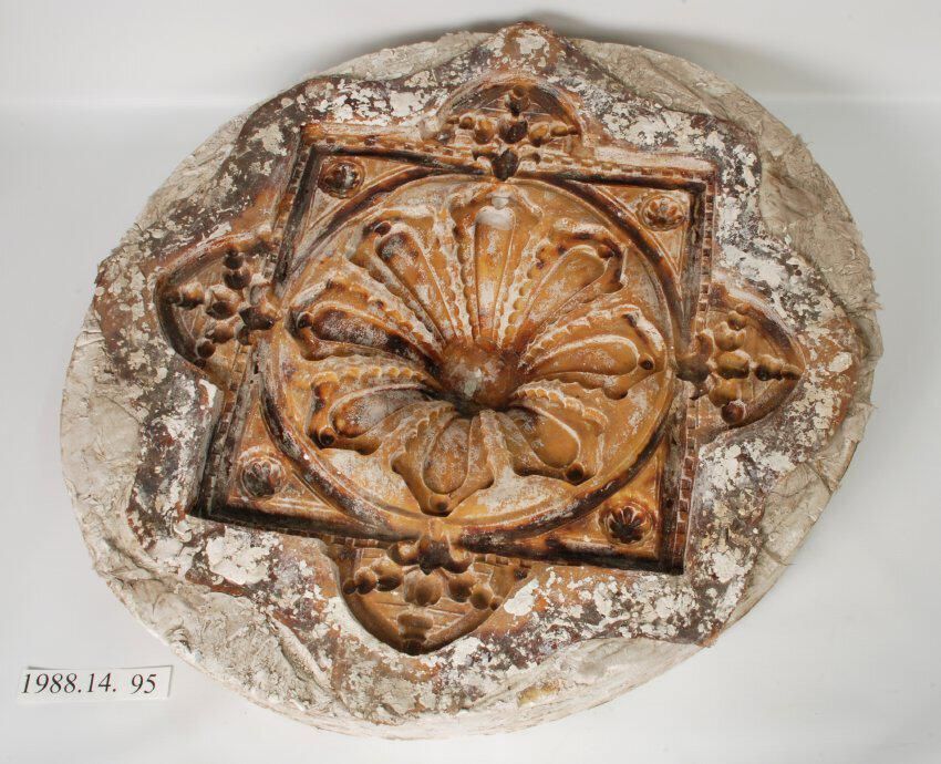 Rubber facing with oval plaster mother mold. Geometric / botanical motif. Circular center with square perimeter, with protruding ornamentation.
