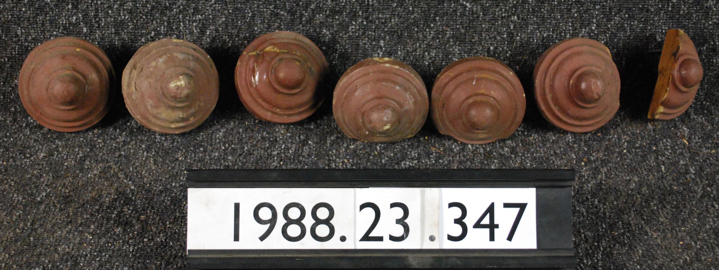 One lot of seven exterior wood bullseye ornaments. Some are incomplete. Painted dark reddish-brown. Inscriptions or Markings: Manufacturer: Place of Manufacturer: Design motif: Style: Finish: Painted Dark Reddish-Brown