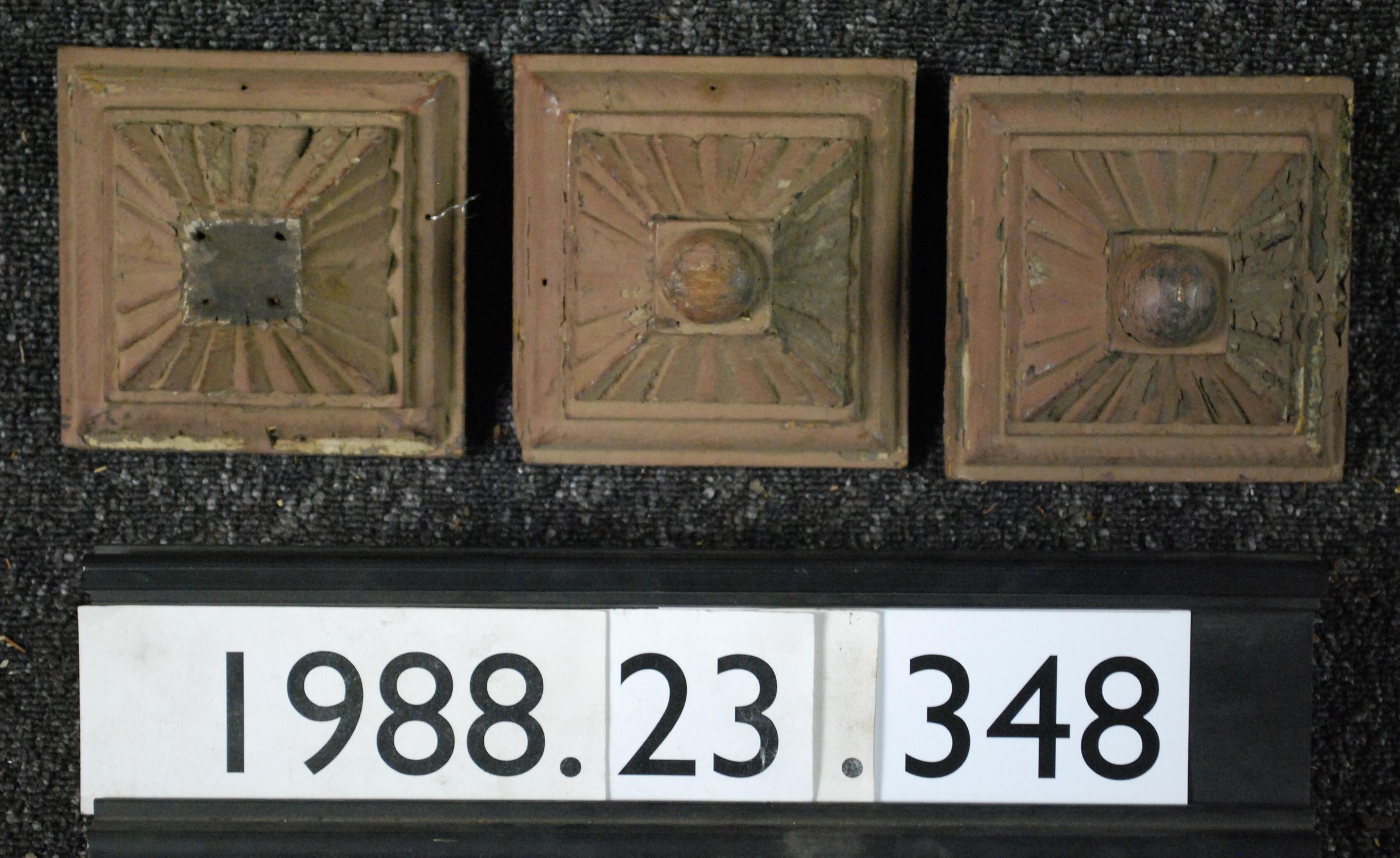 One lot of three square semi-pyramidal block ornaments. One center piece is missing from block. Painted dark reddish-brown.