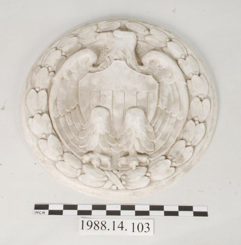 Reproduction molded plaster medallion with laurel leaf motif around perimeter. Stylized eagle with patriotic United States shield.