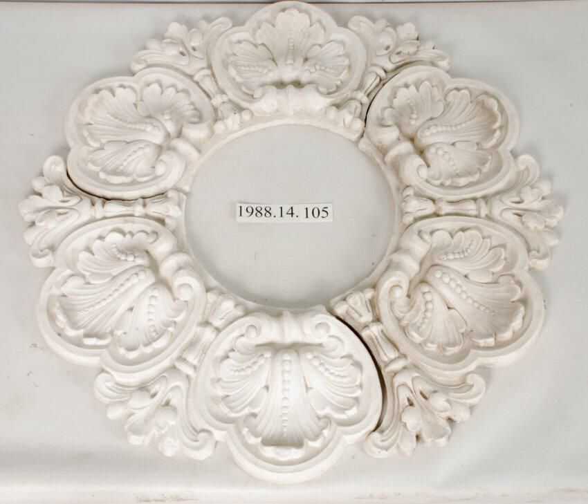 Reproduction molded plaster semi-circular segments with repeating trefoil foliation / scroll. Has folliated appendages between. Three segments form circular surround.
