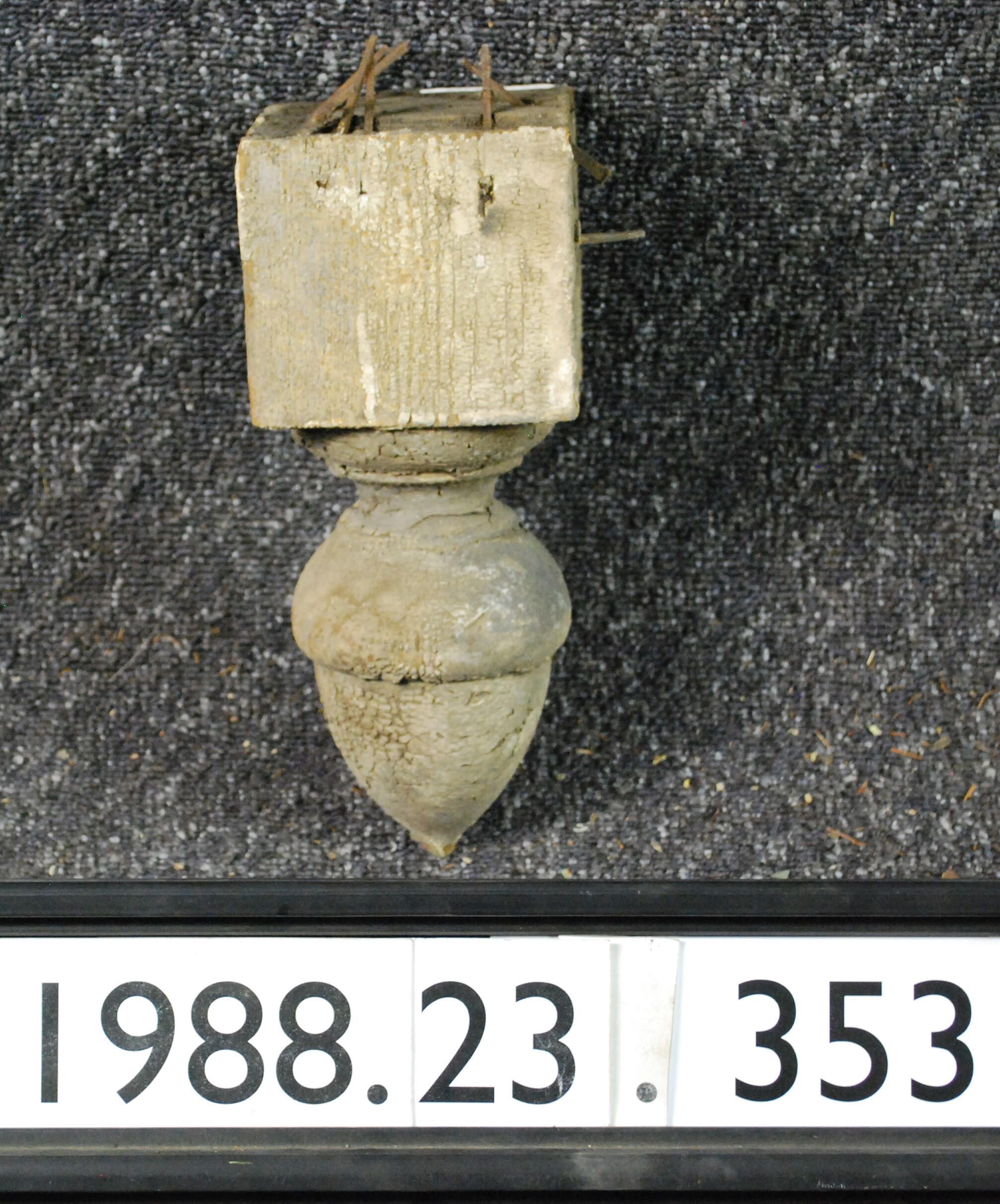 Exterior wood turned drop ornament. Painted (grey?). Inscriptions or Markings: Manufacturer: Place of Manufacturer: Design motif: Style: Finish: Painted (Grey?)
