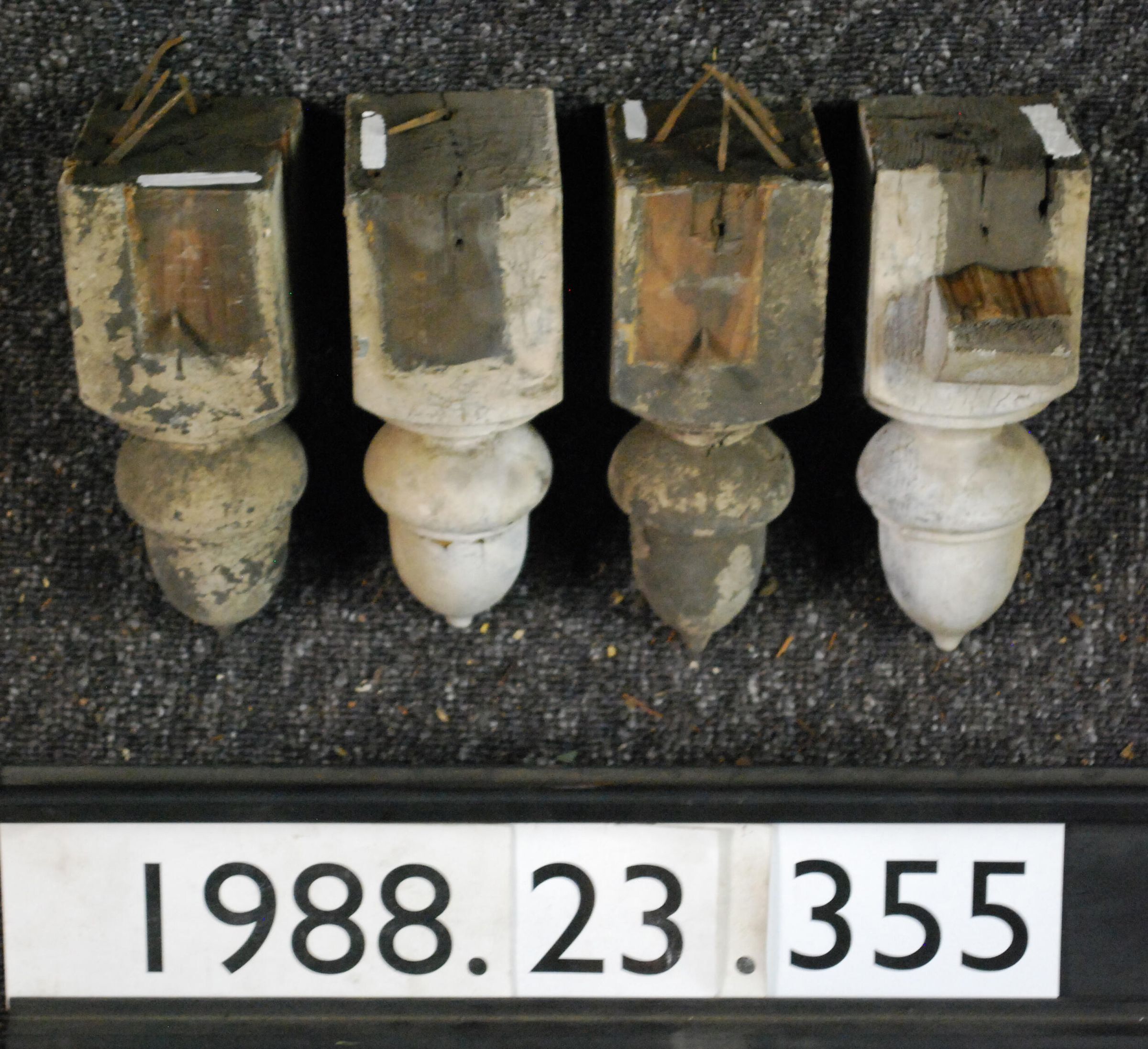 One lot of four exterior wood turned drop ornaments. Painted white / grey. Inscriptions or Markings: Manufacturer: Place of Manufacturer: Design motif: Style: Finish: Painted White / Grey