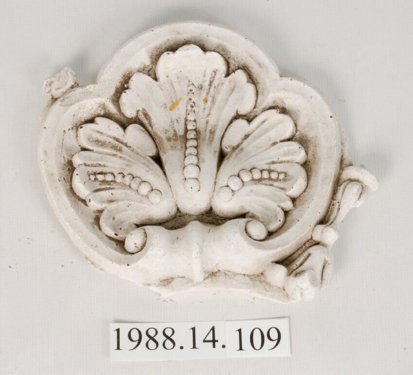 Reproduction molded plaster. Trefoil / scroll motif. Untrimmed edges. Wire loop on back.