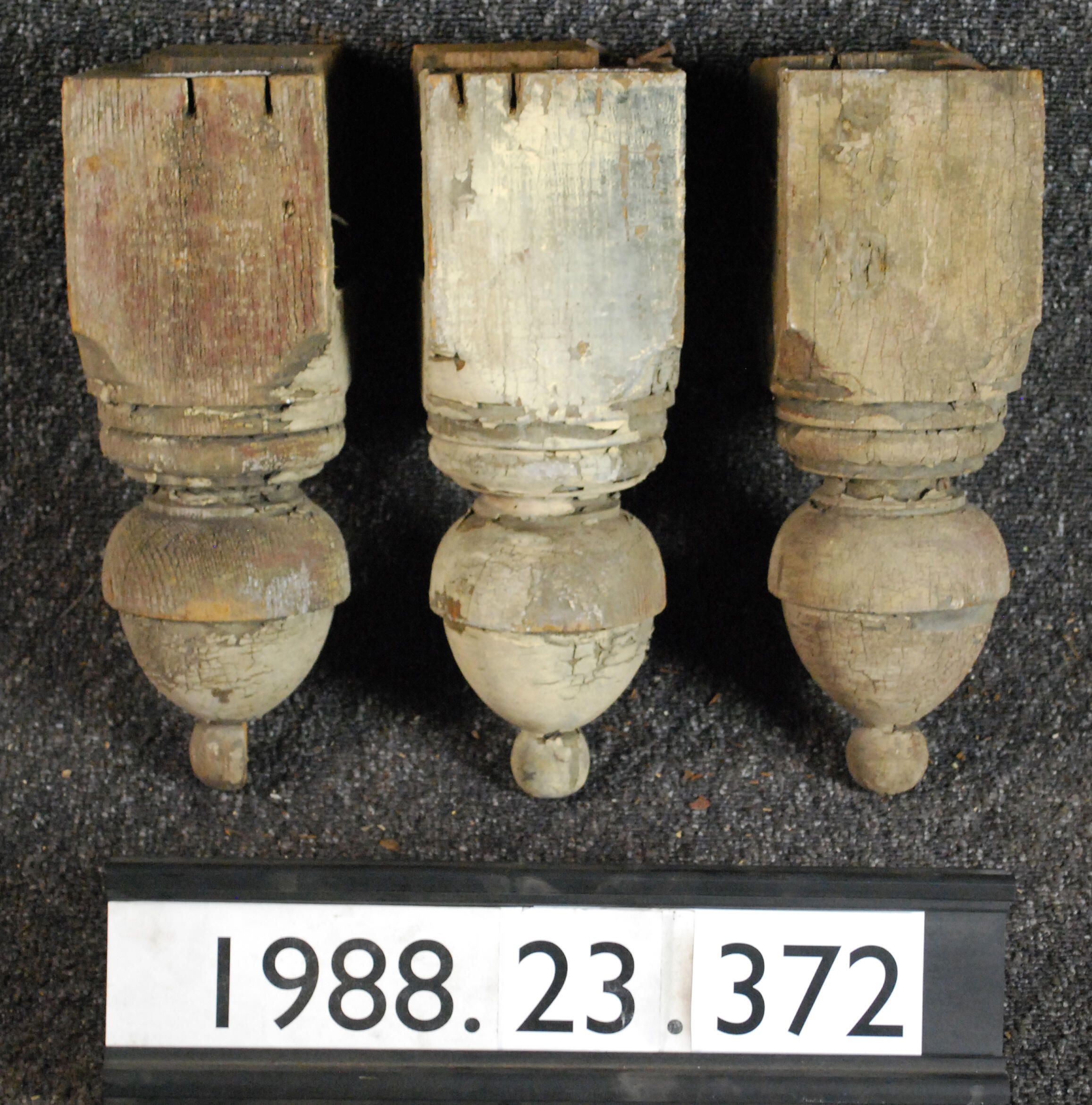 One lot of three exterior wood turned drop ornaments. Painted tan. Inscriptions or Markings: Manufacturer: Place of Manufacturer: Design motif: Style: Finish: Painted Tan