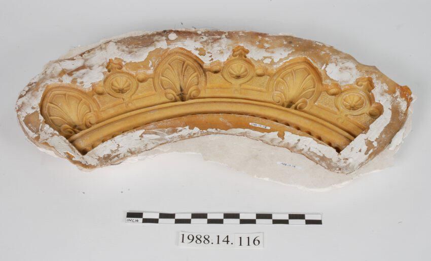 Rubber facing with mother mold to cast surround segment for ceiling medallion. Beaded interior edge. Outer edge has series of stylized scrolled shield shaped appendages, rosettes, darts.