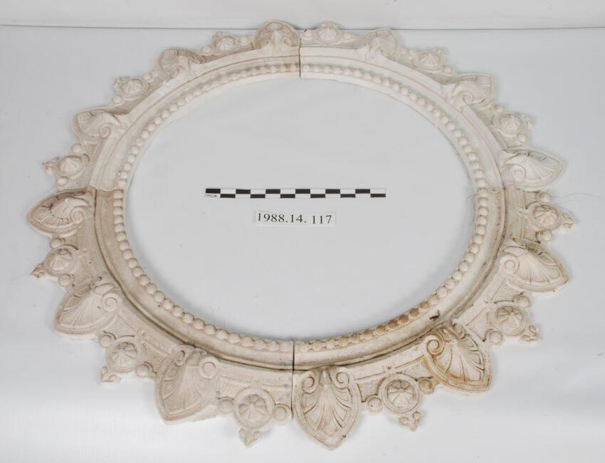 Reproduction molded plaster. Four semi-circular segments. Beaded interior edge. Outer edge has series of stylized scrolled shield-shaped appendages, rosettes, darts, and beaded edge. Together four segments compose a circular surround. Each segment is approximately 23.75 inches long. (Two segments are broken).