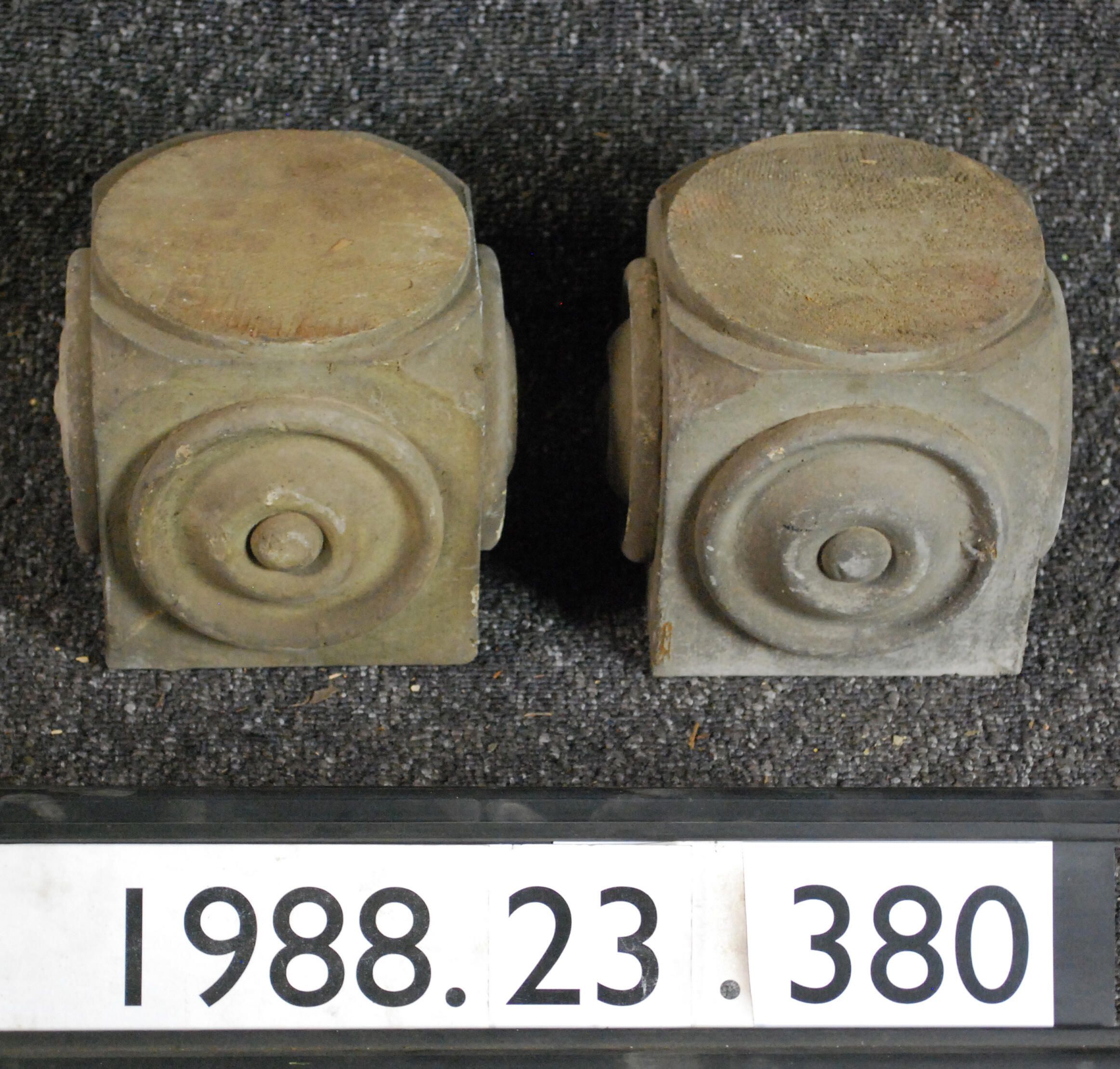 Exterior wood block with applied bullseye ornament on four sides. Painted grey. Inscriptions or Markings: Manufacturer: Place of Manufacturer: Design motif: Style: Finish: Painted Grey