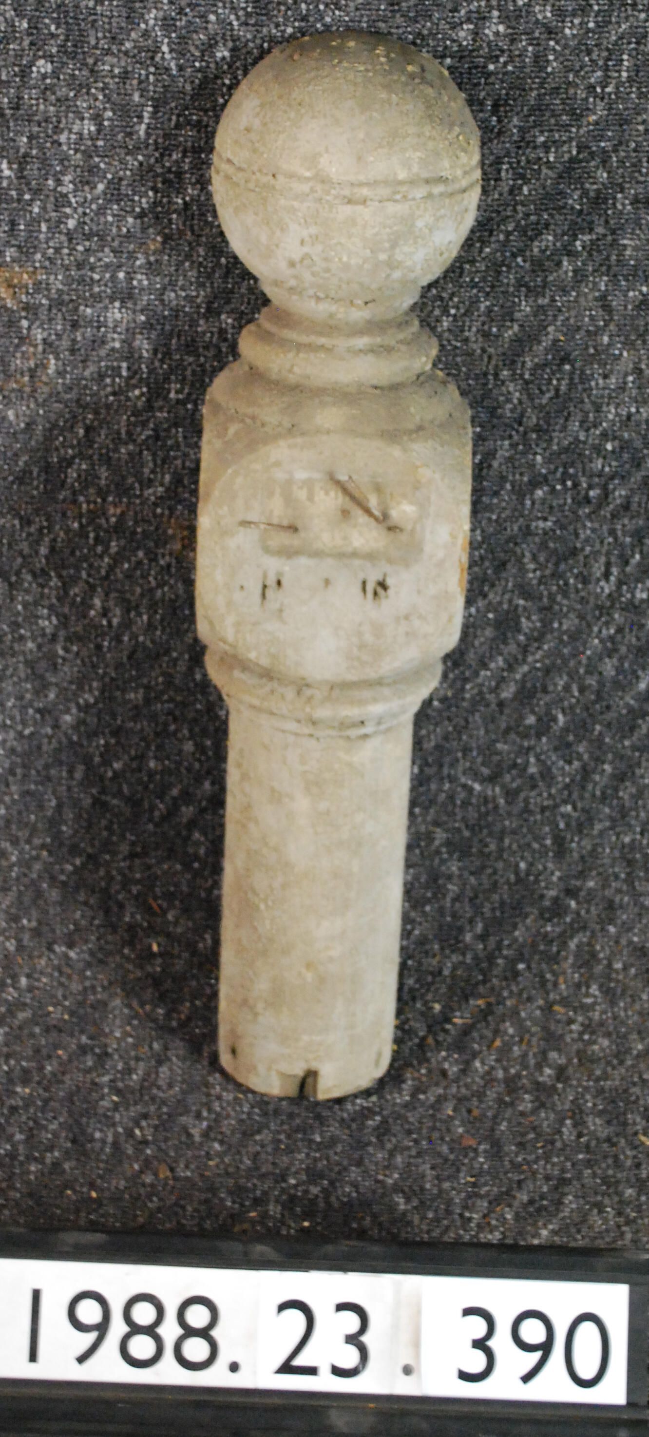 Exterior wood turned post (half-turned cross-section). Possibly originally for attachment of porch railing. Painted grey. Inscriptions or Markings: Manufacturer: Place of Manufacturer: Design motif: Style: Finish: Painted Grey