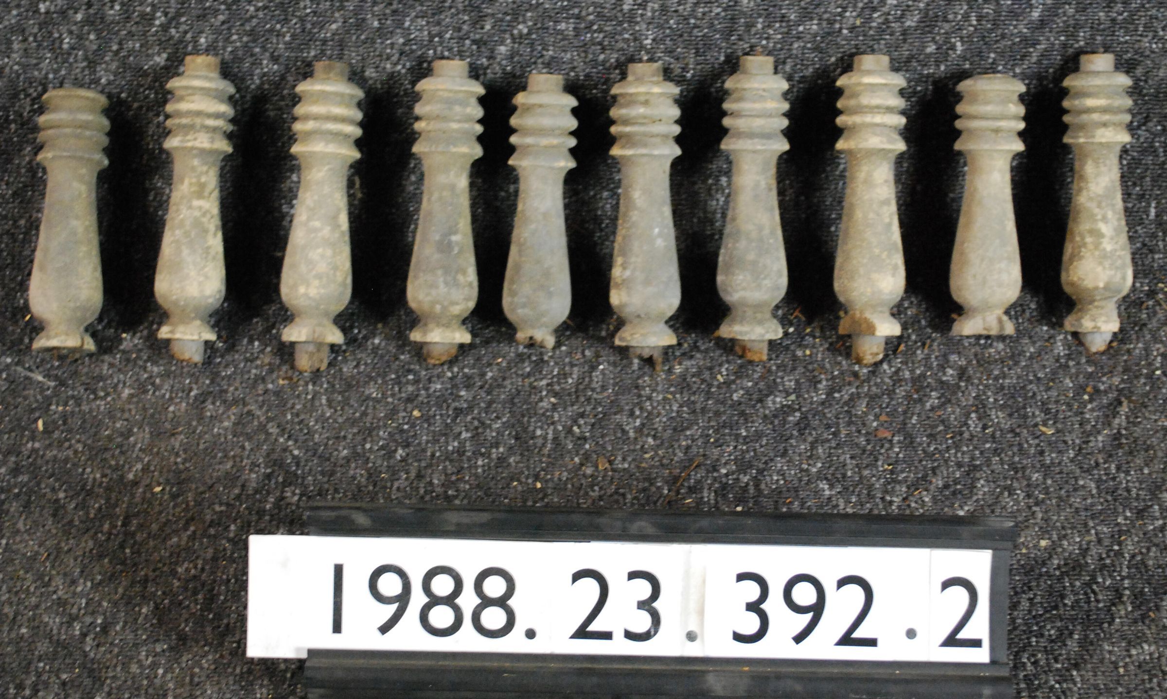One lot of ten exterior wood turned spindles. Same pattern as 1988.23.392. Some parts truncated. Painted grey. Inscriptions or Markings: Manufacturer: Place of Manufacturer: Design motif: Style: Finish: Painted Grey