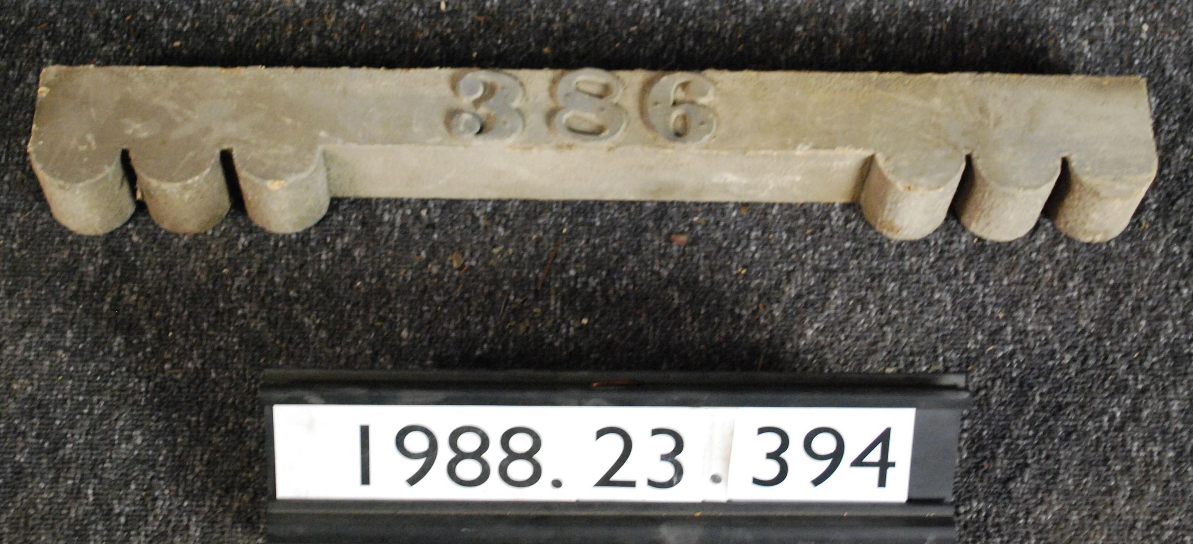 Exterior wood ornament. Fret-sawn. has applied metal numbers for address: "386." Painted grey.