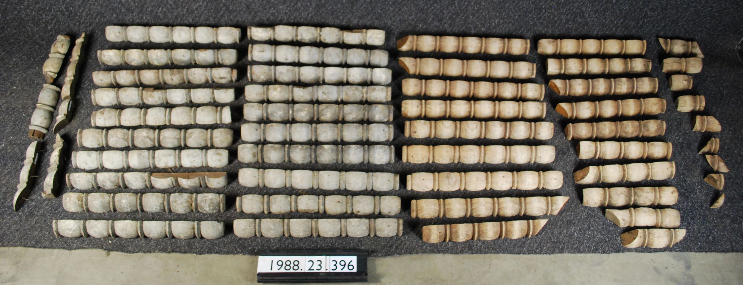 One lot of fifty-four turned moldings. Quarter round in cross-section. Various lengths. Twenty-six are painted grey. Twenty-eight are stripped of paint.