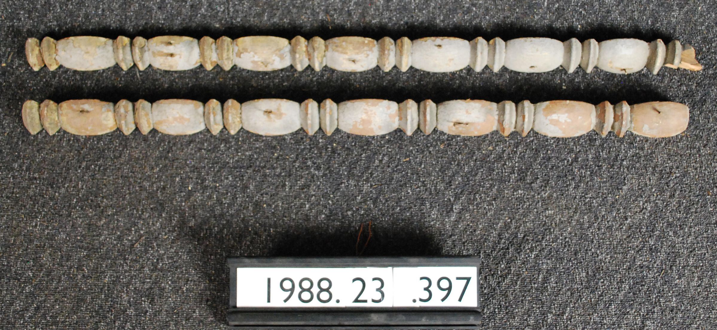 One lot of two exterior wood turned moldings. Quarter round in cross-section. Painted grey. Inscriptions or Markings: Manufacturer: Place of Manufacturer: Design motif: Style: Finish: Painted Grey