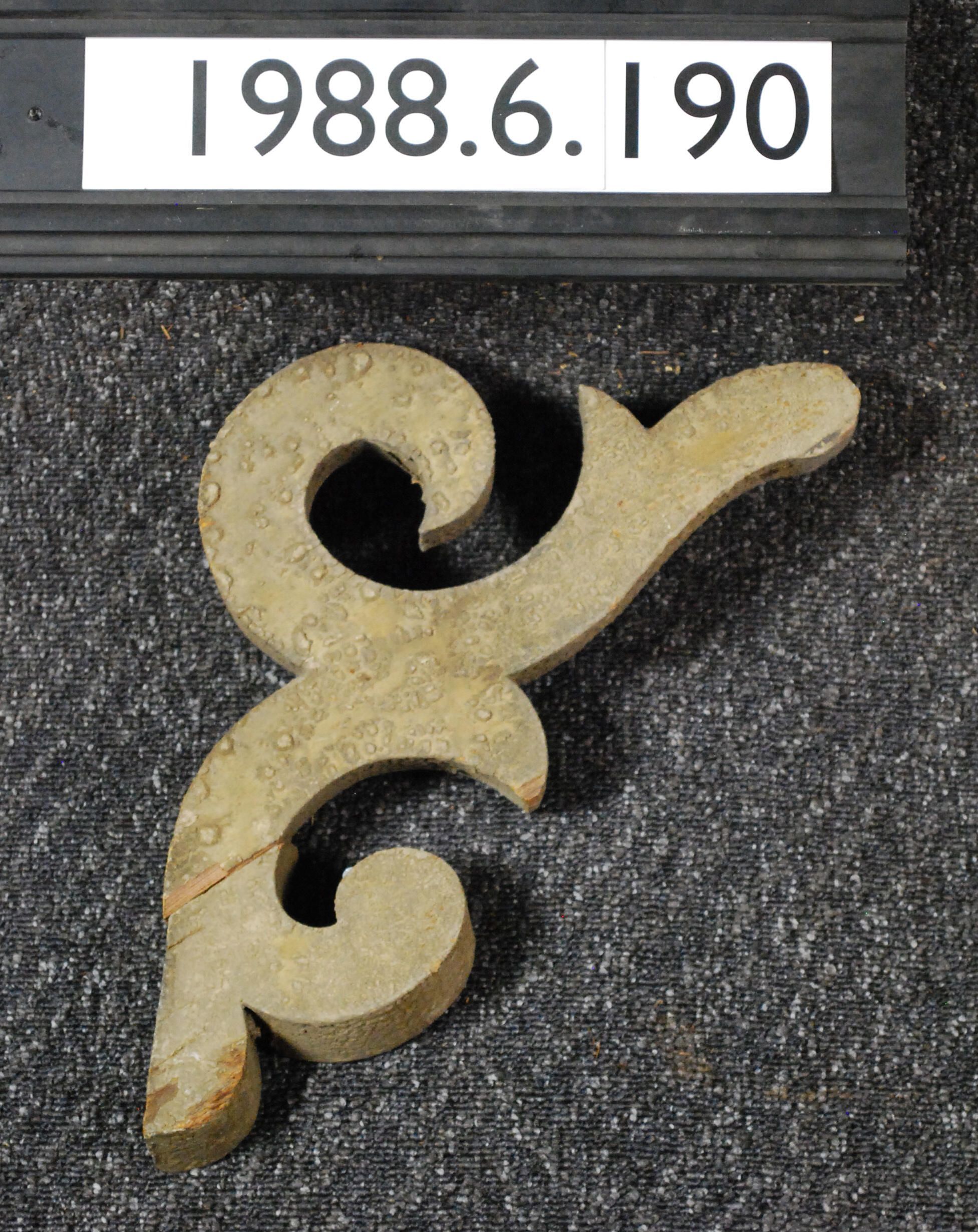 Exterior wood bracket. Fret-cut. Scroll motif. Broken into two pieces.. Painted greenish-grey. Inscriptions or Markings: Manufacturer: Place of Manufacturer: Design motif:: Scroll Style: Finish: Painted Greenish-Grey