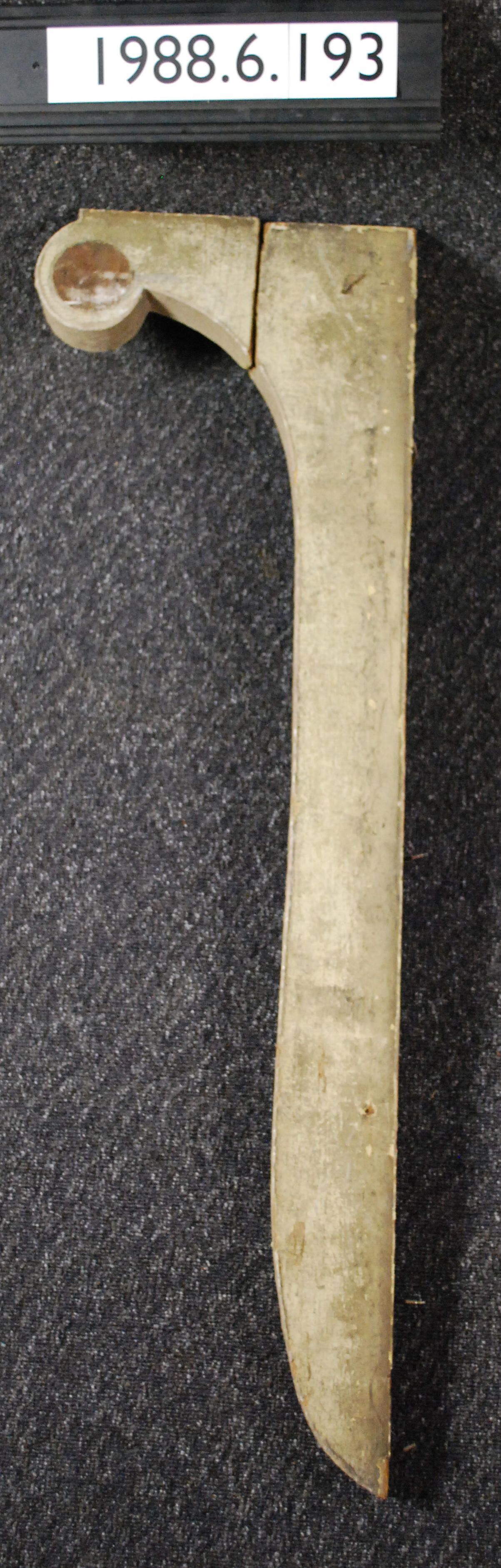 Exterior/interior wood bracket. Fret-cut. Simple curvature. Broken into two pieces. Painted beige / light tan. Inscriptions or Markings: Manufacturer: Place of Manufacturer: Design motif:: Style: Finish: Painted Beige / Light Tan