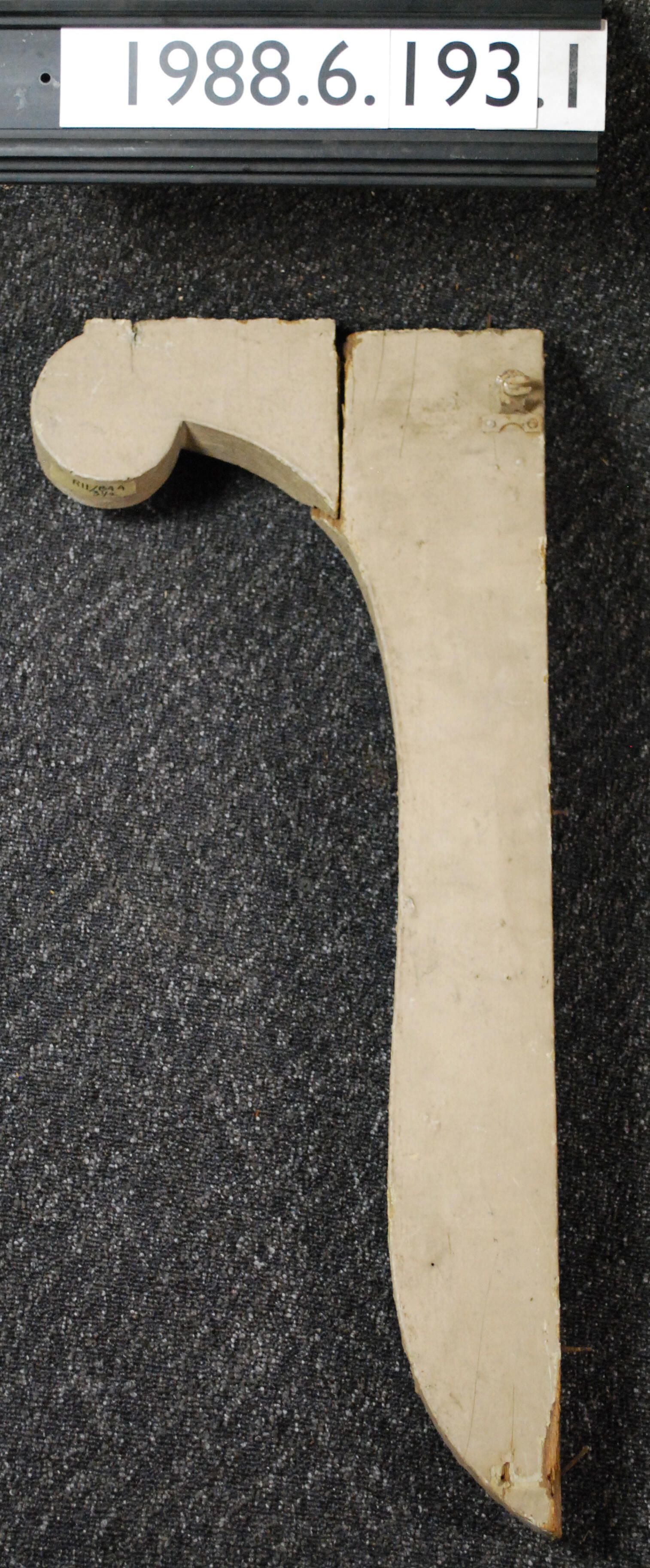 Exterior/interior wood bracket. Fret-cut. Simple curvature. Broken into two pieces. Painted beige / greyish tan. Inscriptions or Markings: Manufacturer: Place of Manufacturer: Design motif:: Style: Finish: Painted Beige / Greyish Tan