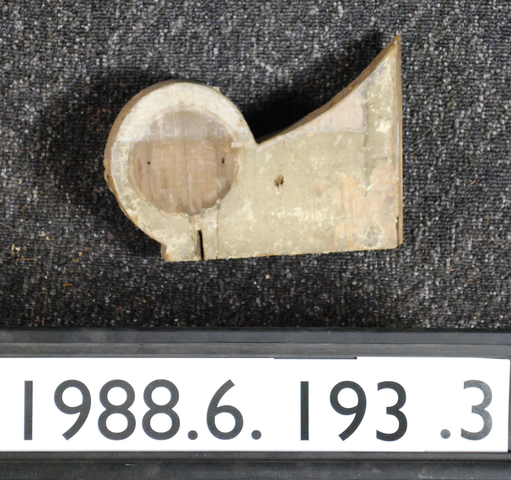 Exterior/interior wood bracket fragment.Painted beige / greyish tan. Inscriptions or Markings: Manufacturer: Place of Manufacturer: Design motif:: Style: Finish: Painted Beige / Greyish Tan
