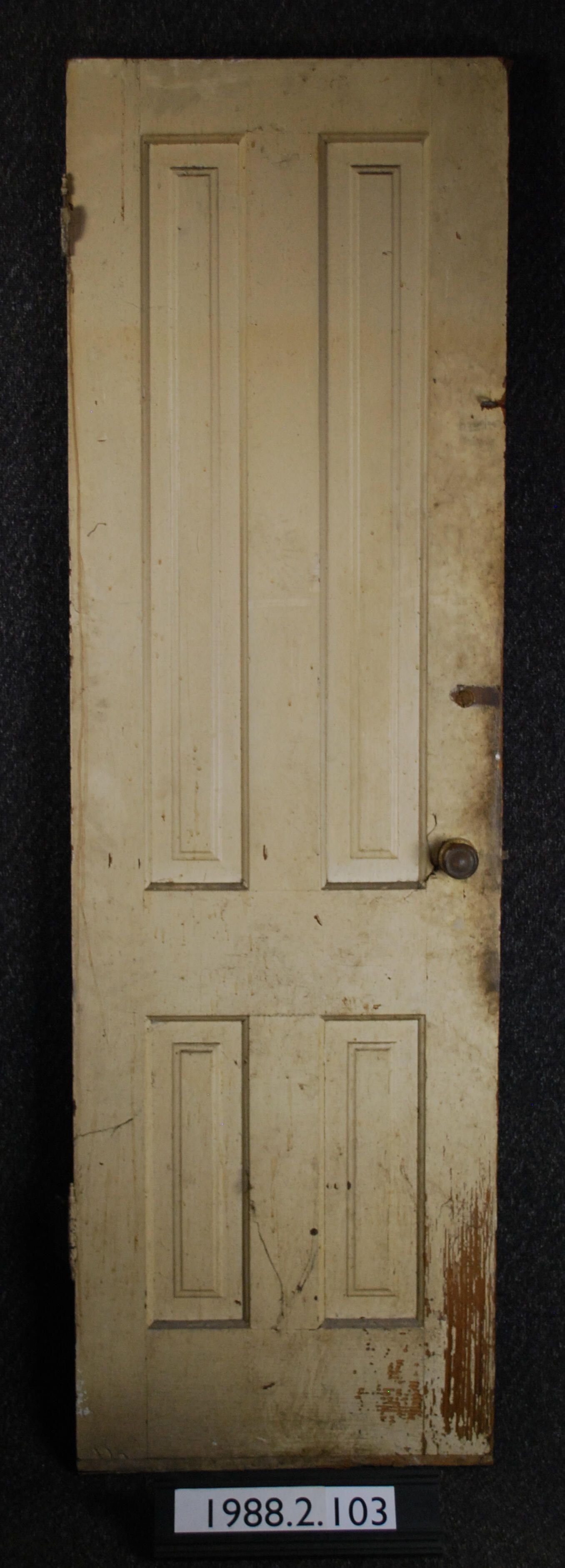 Interior bathroom? door. Four panel. Has two steel knobs and spring latch. Two cast iron hinges. One hinge is broken. Incomplete. Painted cream colored on both sides.