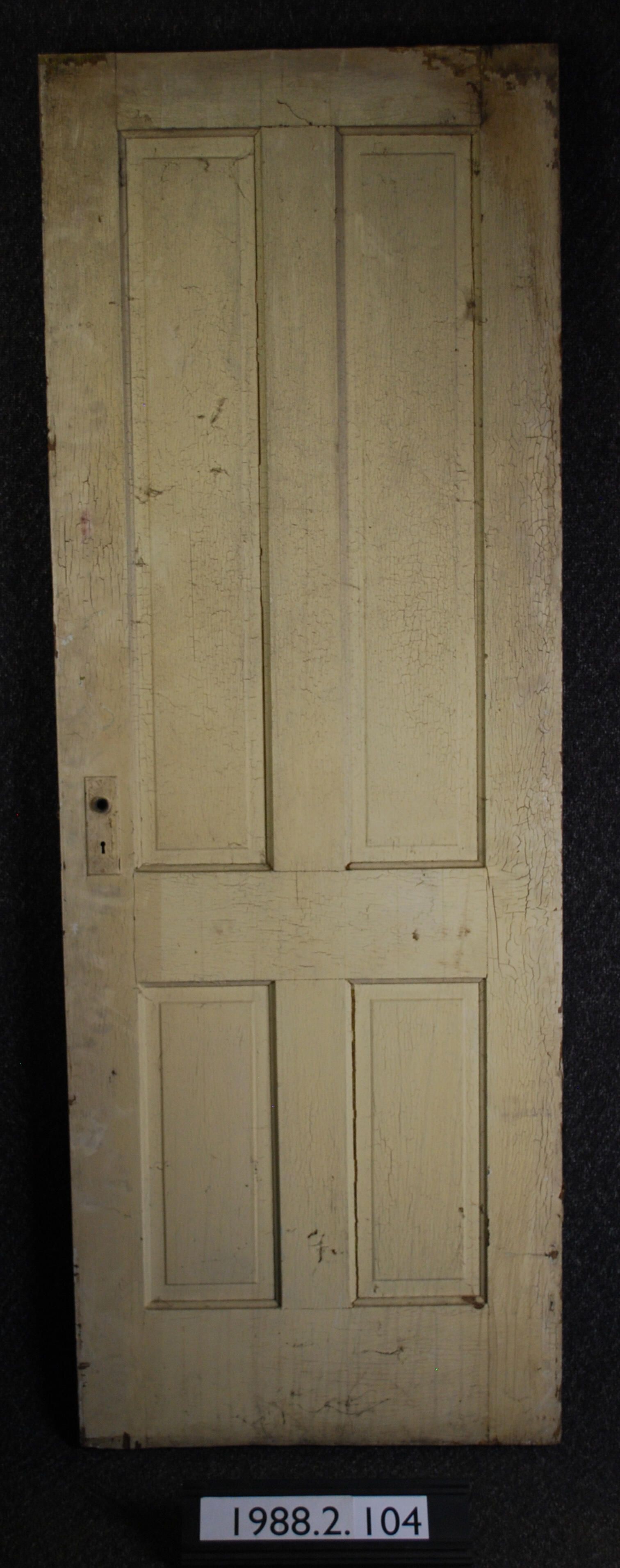 Interior door. Four panel. Has mortice lock. Pair of back plates. Knobs are missing. Has two incomplete hinges. Painted yellow. Inscriptions or Markings: Manufacturer: Place of Manufacturer: Design Motif: Style: Finish: Painted Yellow