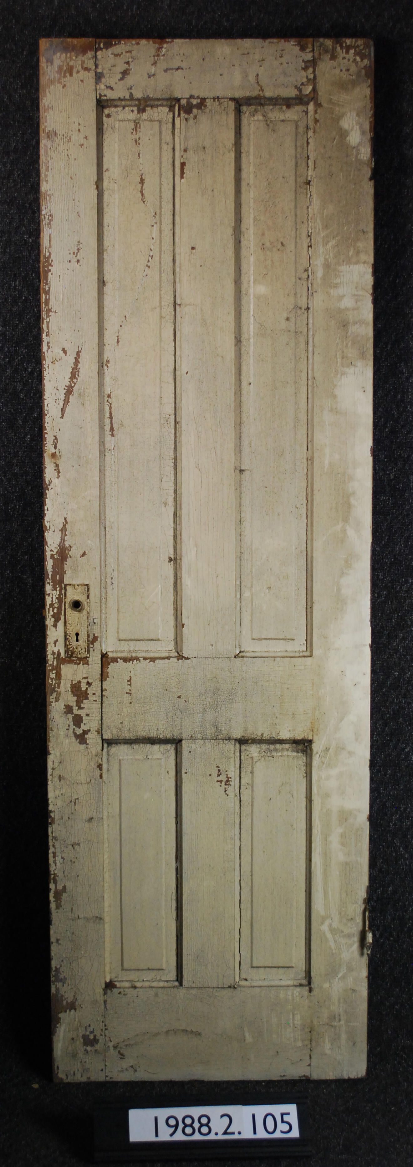 Interior door. Four panel. Has mortice lock. Has two back plates. Knobs are missing. Has two hinge leaves - one is incomplete. Painted cream / yellow.