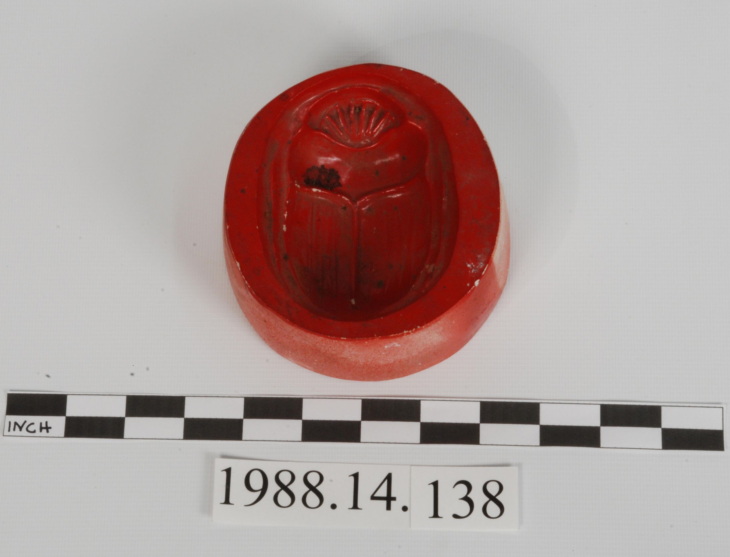 Oval plaster mold to cast scarab beetle motif ornament. Has red paint. Reverse has series of concavities.